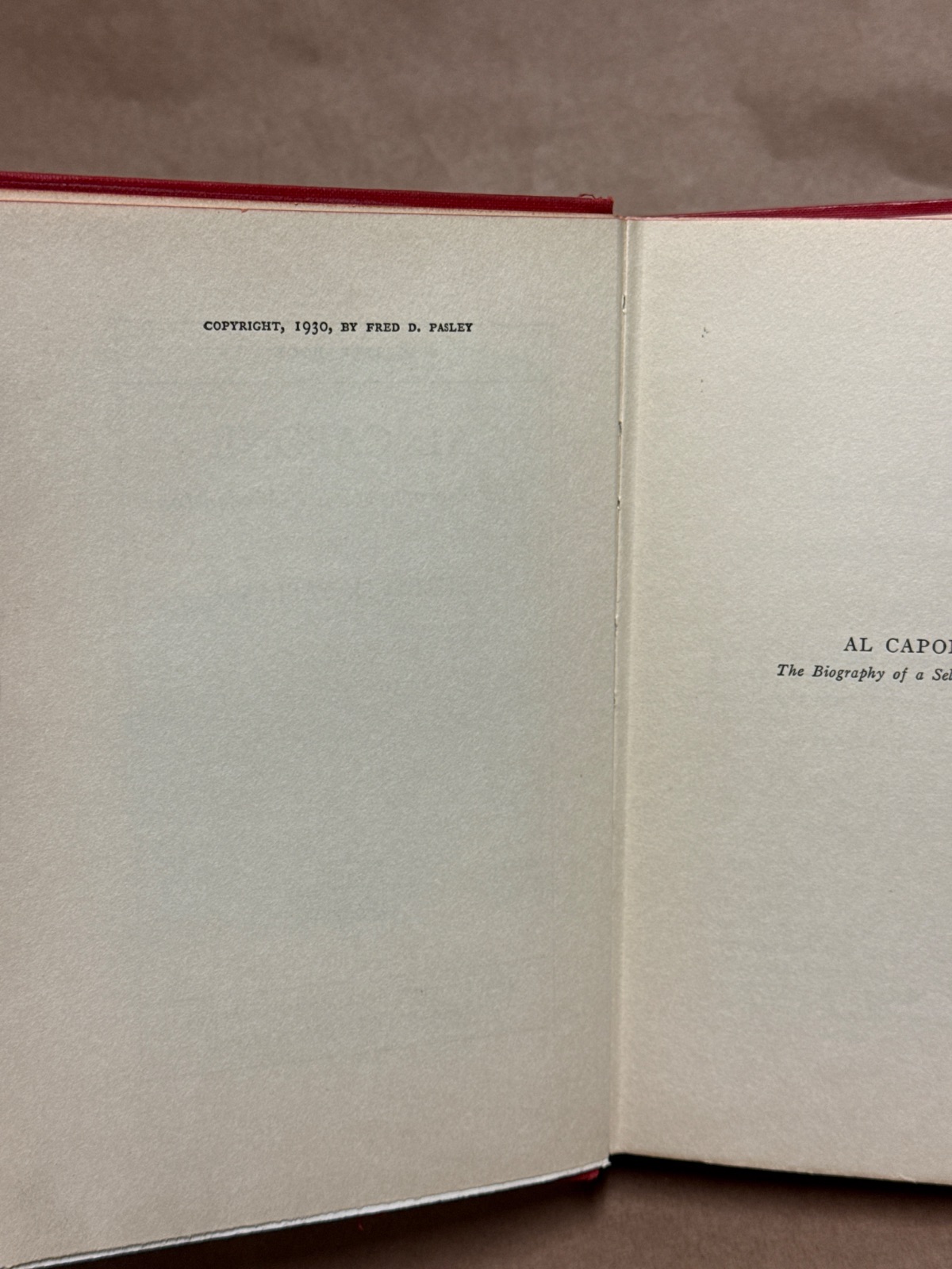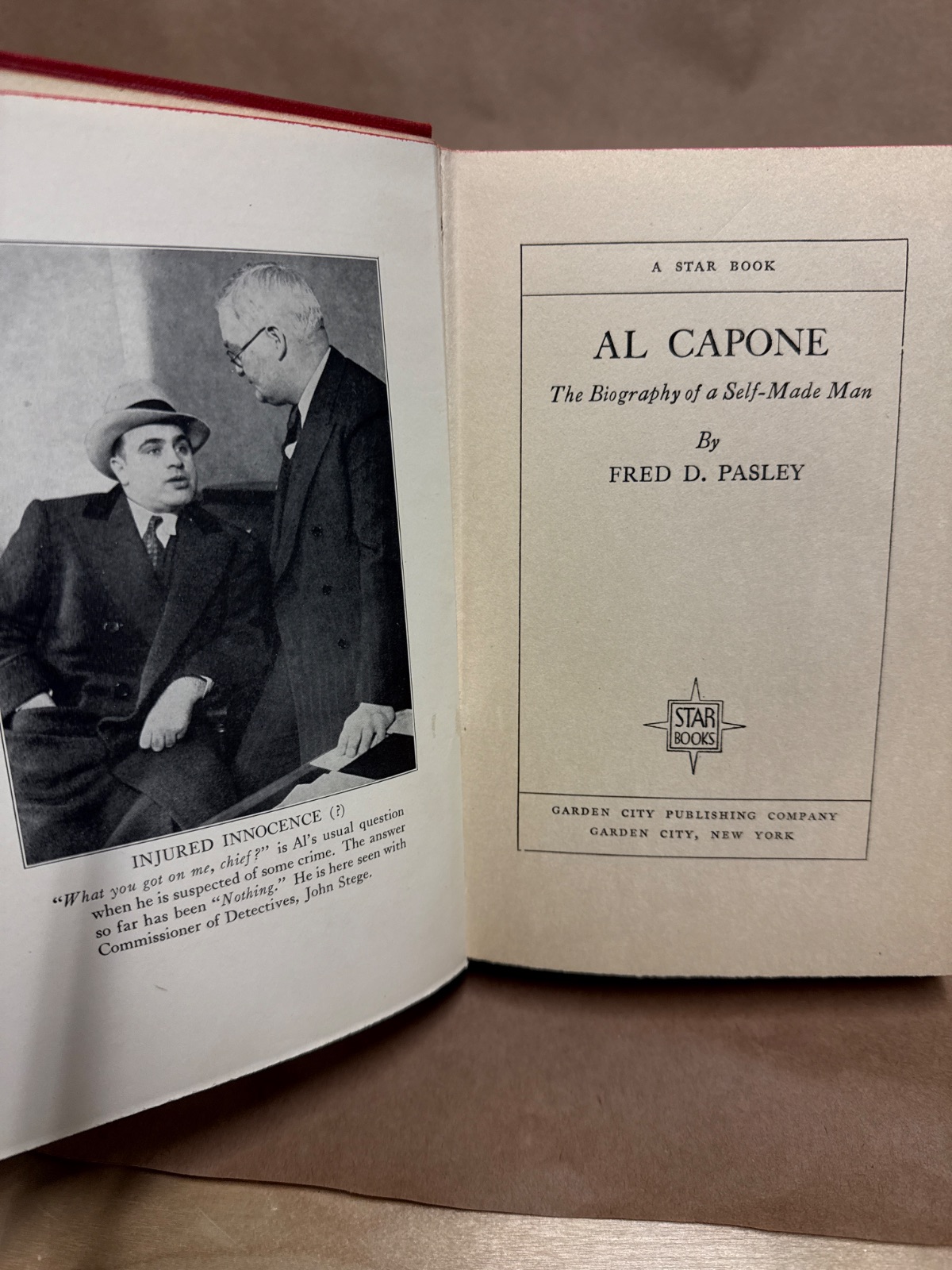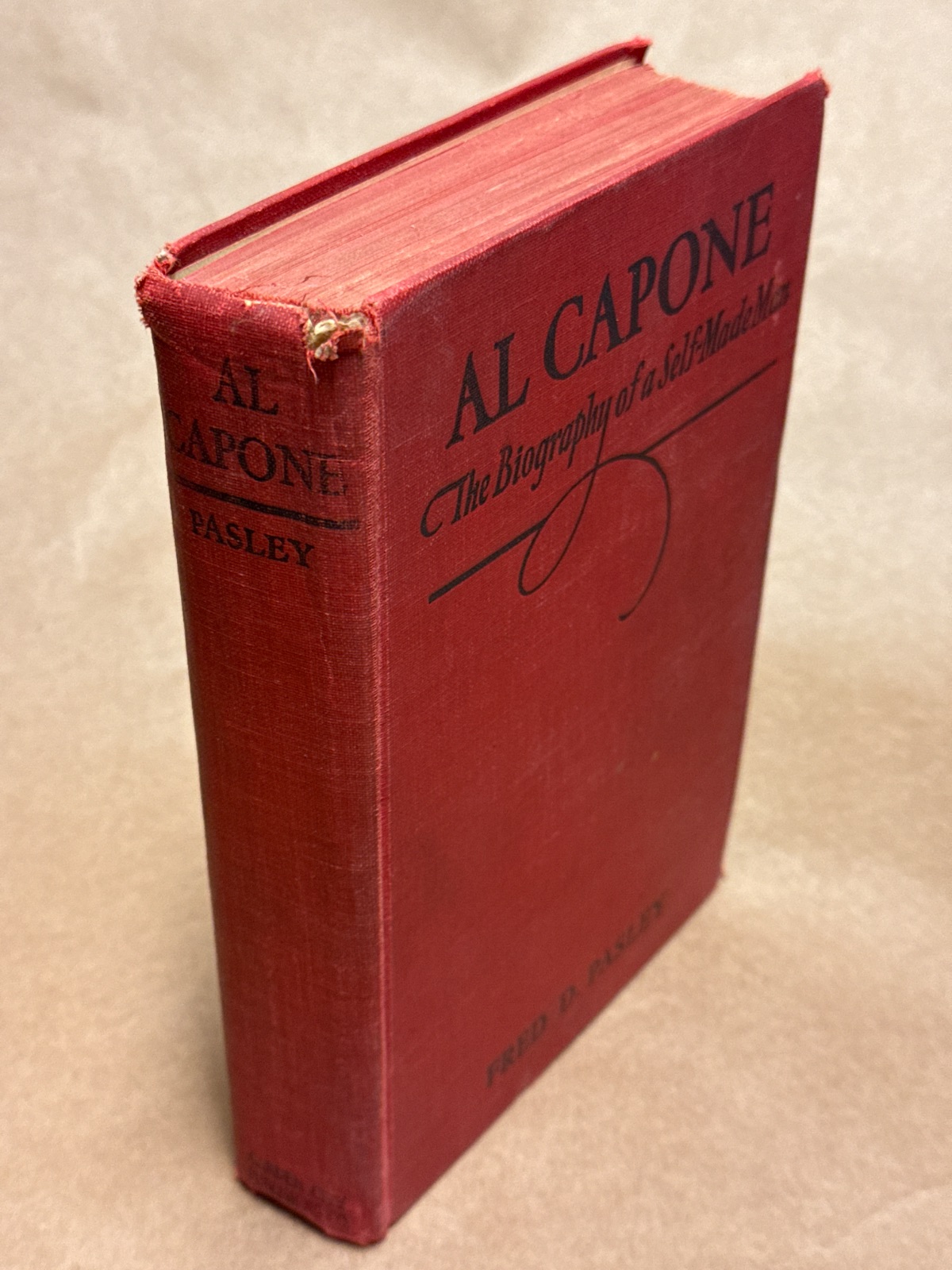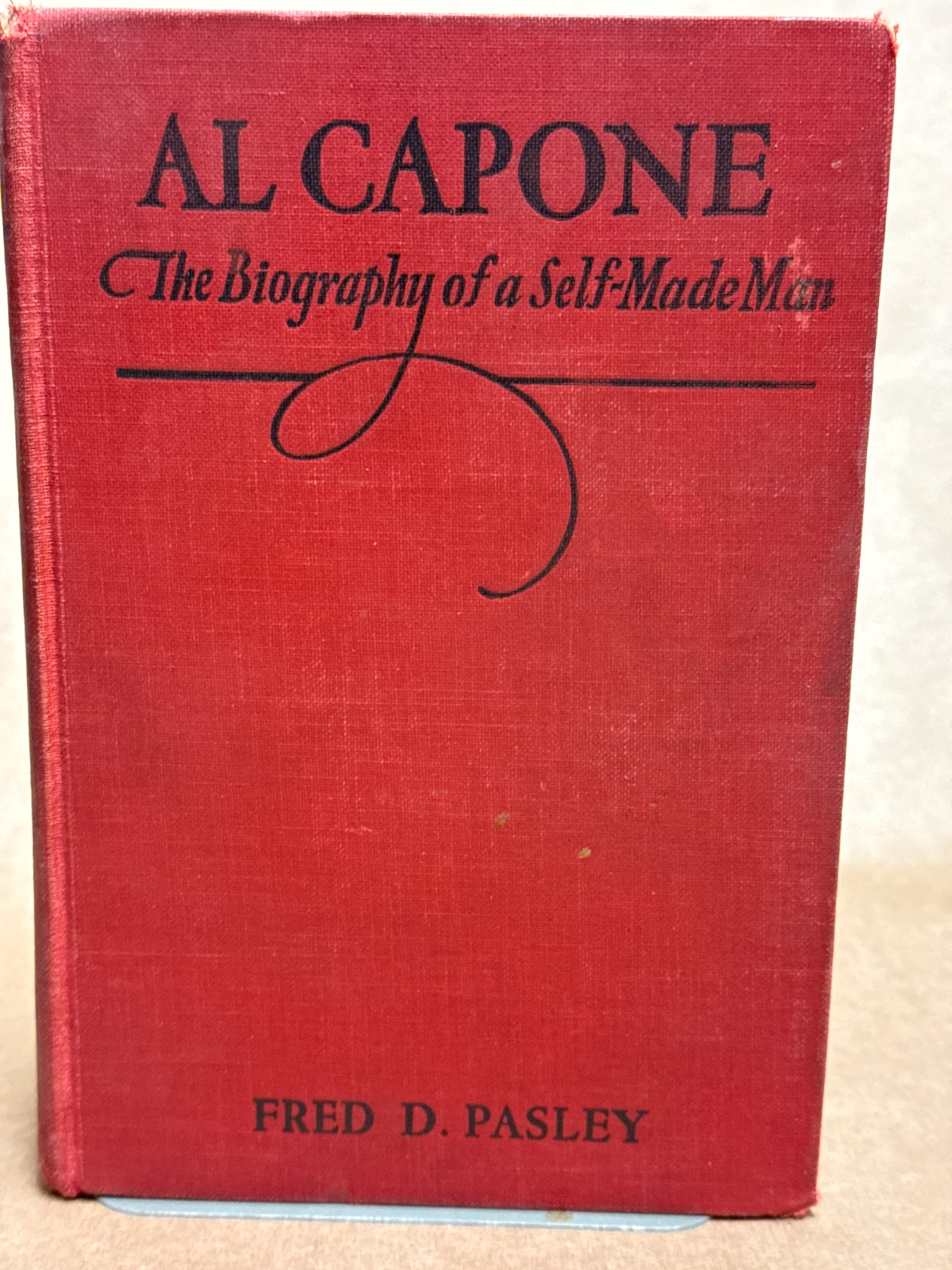 “Al Capone: The Biography of a Self-Made Man” by Fred D. Pasley offers an in-depth look into the life of one of America’s most infamous gangsters. Published by Garden City Publishing Company in 1930, this hardcover edition provides a contemporary account of Al Capone’s rise to power during the Prohibition era. Fred D. Pasley’s work is significant for its detailed portrayal of Capone’s criminal empire and its impact on Chicago and beyond. This edition is a valuable piece for collectors interested in early 20th-century American crime history. The book is bound in red cloth, with the title and author’s name in black on the cover and spine. Despite the absence of a dust jacket, the book remains in good condition with some wear on the spine edges and corners.
