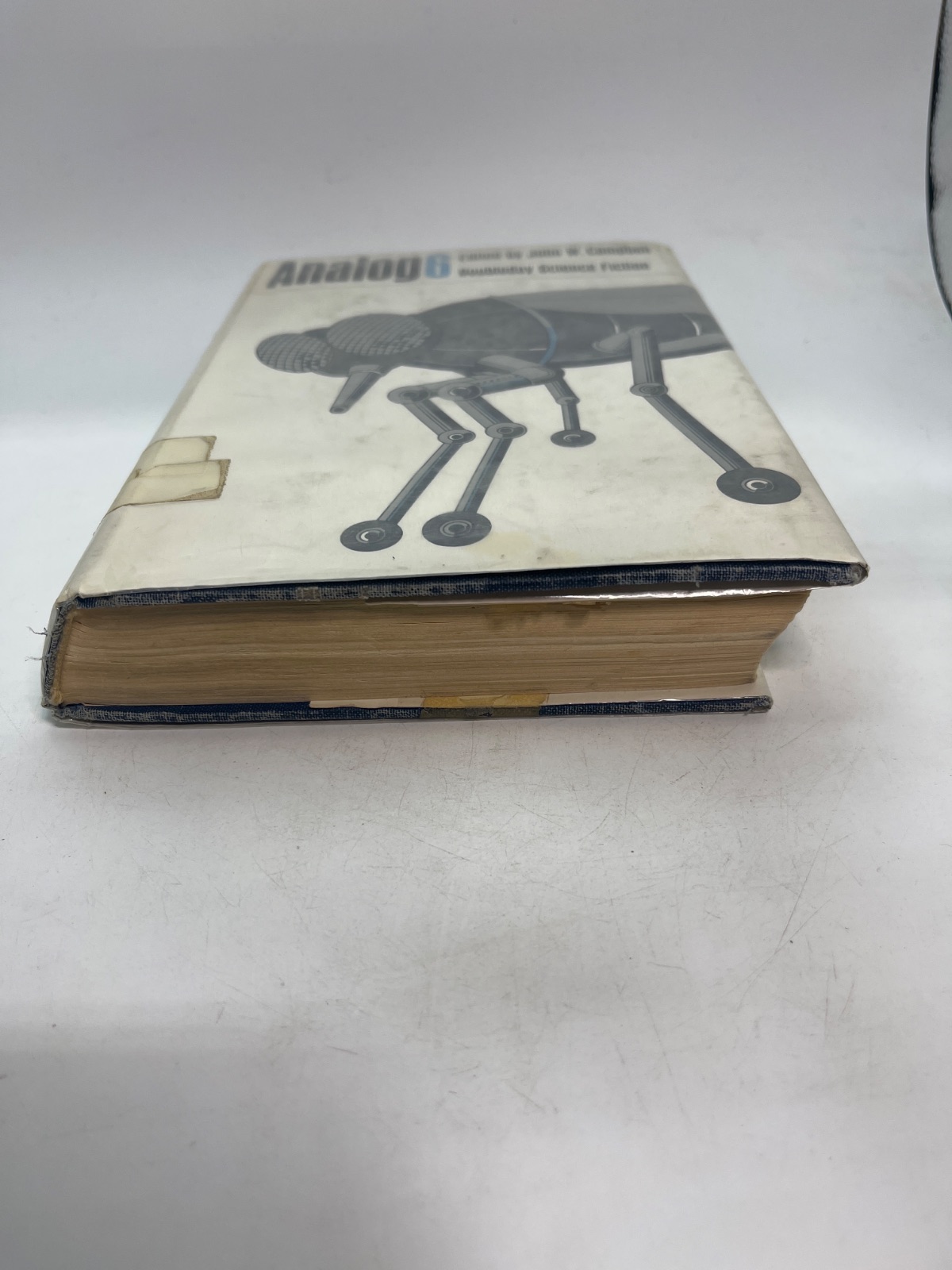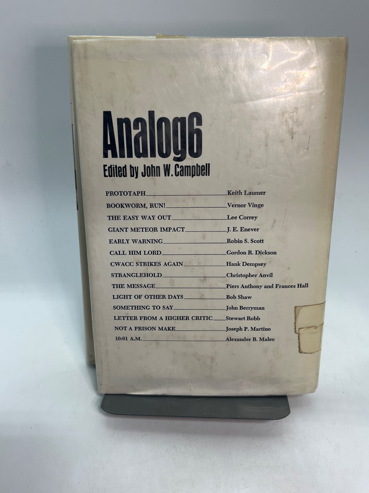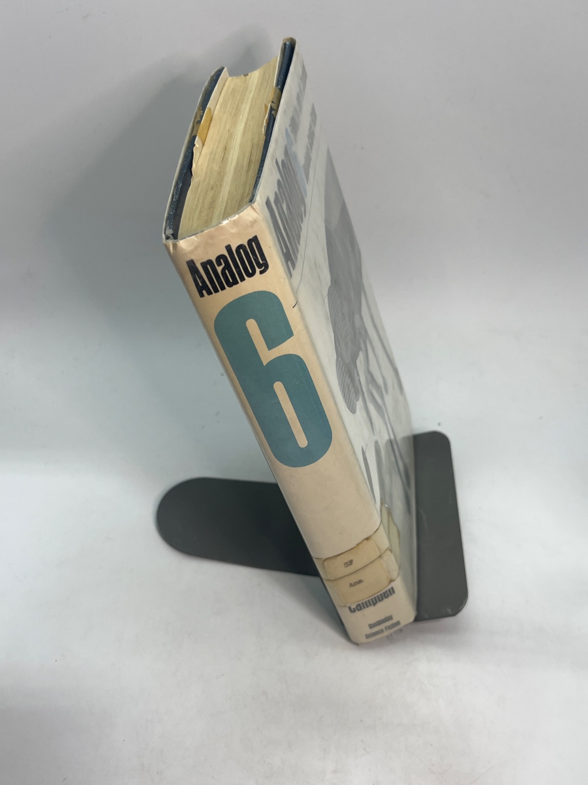 Notes This first edition of "Analog 6" is an ex-library copy, bearing stamps and markings from the Manzano Base Library. The dust jacket is worn, featuring tape repairs and edge wear, yet it remains intact. The hardcover binding shows signs of age, with some discoloration and shelf wear. Despite these flaws, the pages are clean and the text is unmarked, making it a valuable addition for collectors interested in vintage science fiction anthologies.