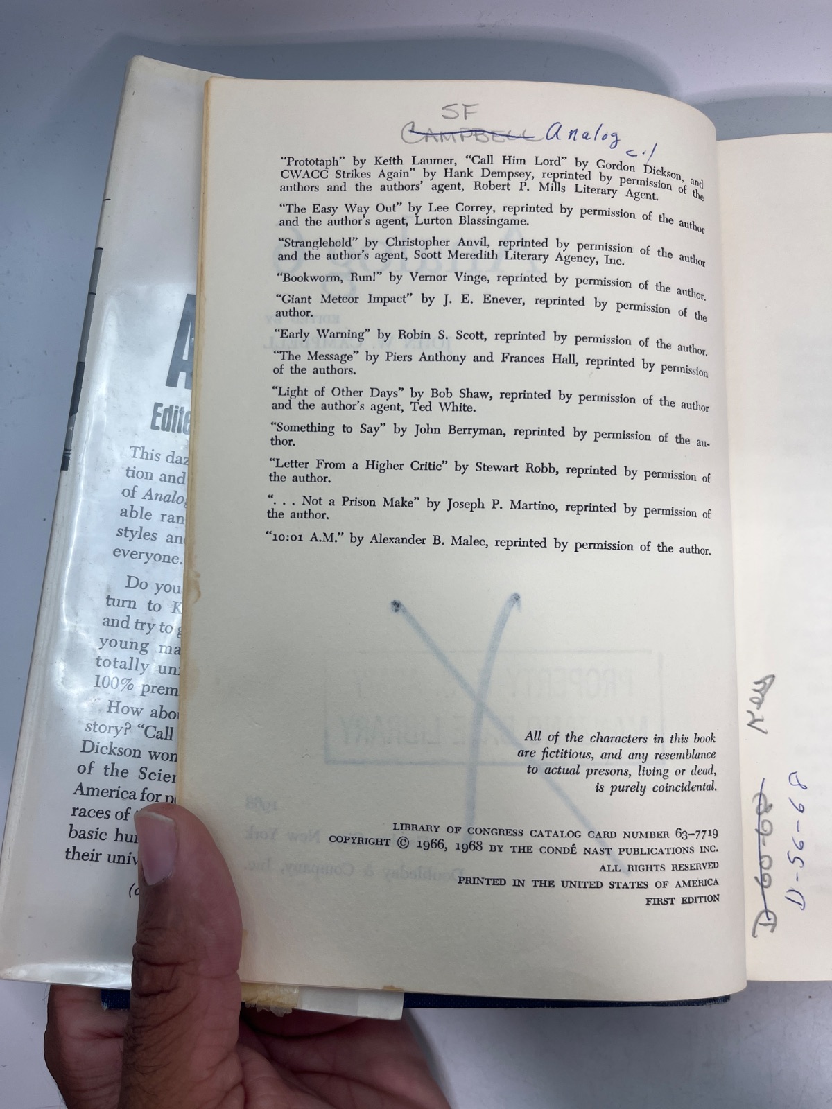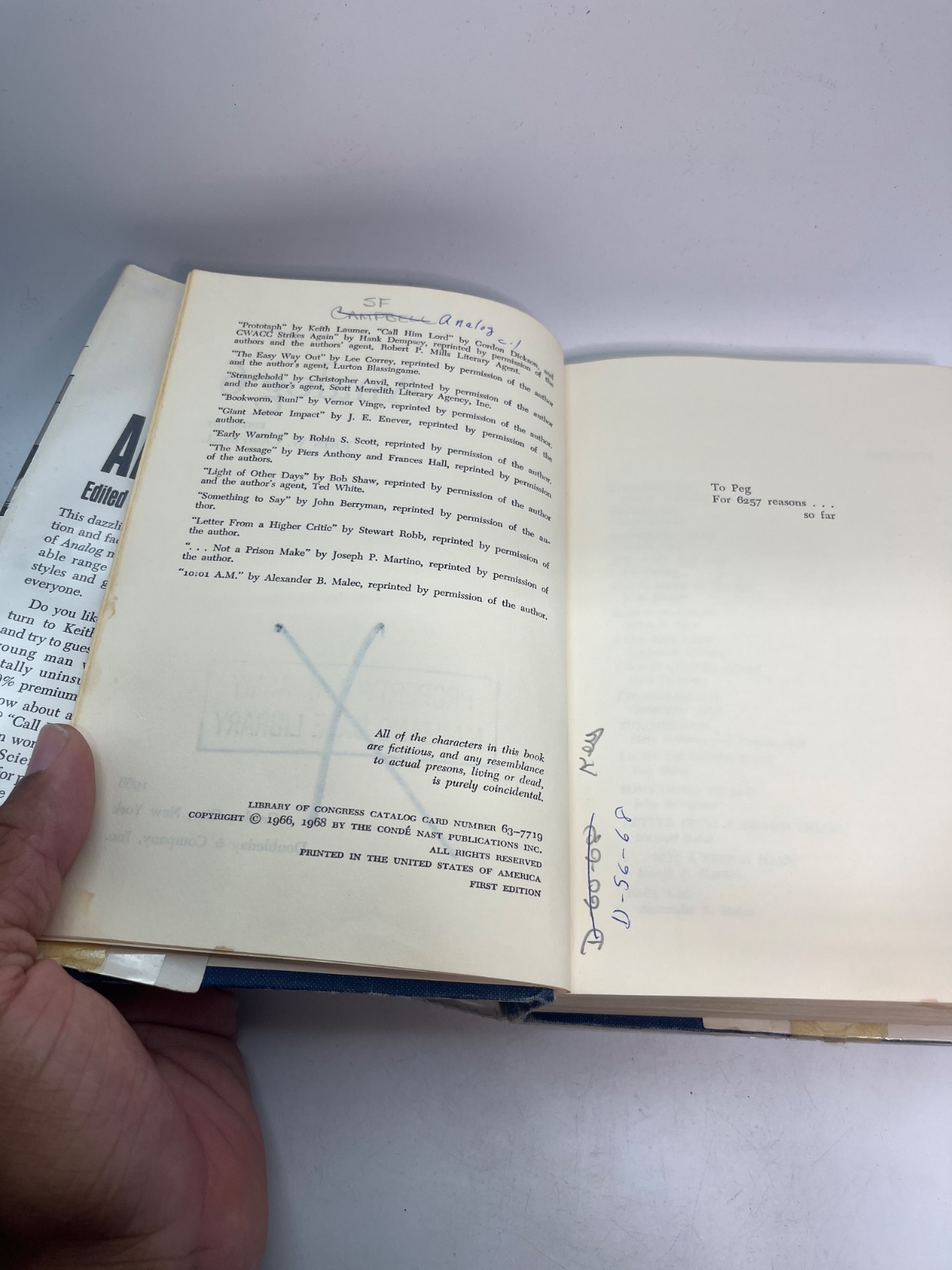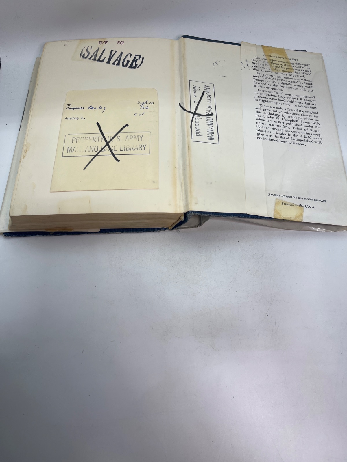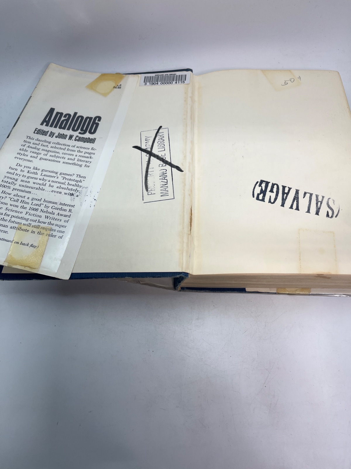 Notes This first edition of "Analog 6" is an ex-library copy, bearing stamps and markings from the Manzano Base Library. The dust jacket is worn, featuring tape repairs and edge wear, yet it remains intact. The hardcover binding shows signs of age, with some discoloration and shelf wear. Despite these flaws, the pages are clean and the text is unmarked, making it a valuable addition for collectors interested in vintage science fiction anthologies.