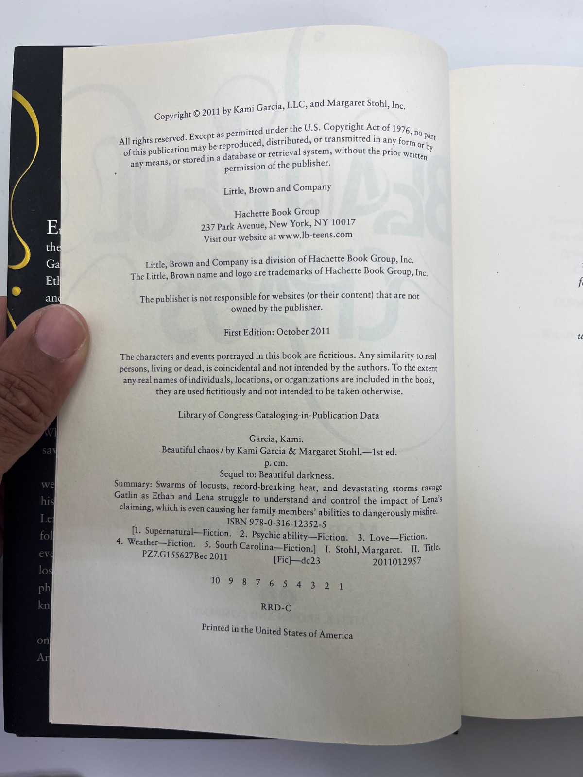 “Beautiful Chaos” by Kami Garcia and Margaret Stohl is an enthralling continuation of the Beautiful Creatures series. Set against the evocative backdrop of Gatlin, South Carolina, this supernatural fiction novel weaves a tale of love, mystery, and psychic abilities. As swarms of locusts and devastating storms ravage the town, protagonists Ethan and Lena face challenges that test their understanding and control over their unique powers. This first edition, published by Little, Brown and Company in October 2011, offers readers a gripping narrative filled with unexpected twists and emotional depth. Ideal for collectors and fans of the series, “Beautiful Chaos” promises a captivating journey into a world where choices are difficult, and consequences are deadly.