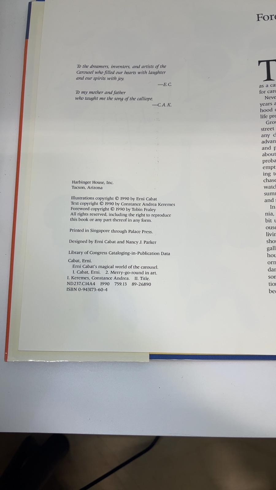 Step into the enchanting world of “Carousel” by Erni Cabat, a captivating book that celebrates the artistry and whimsy of carousels. Published by Harbinger House in 1990, this beautifully illustrated volume is a visual feast for art lovers and carousel enthusiasts alike. Erni Cabat’s vibrant paintings bring each carousel creature to life, accompanied by poetic verses from Constance Andrea Keremes and a thoughtful foreword by Tobin Fraley. The book serves as a tribute to the magic and nostalgia of merry-go-rounds, blending art and poetry in a way that captivates both the young and the young at heart. Whether you’re a collector of rare books or simply enchanted by carousels, “Carousel” is a delightful addition to any library.