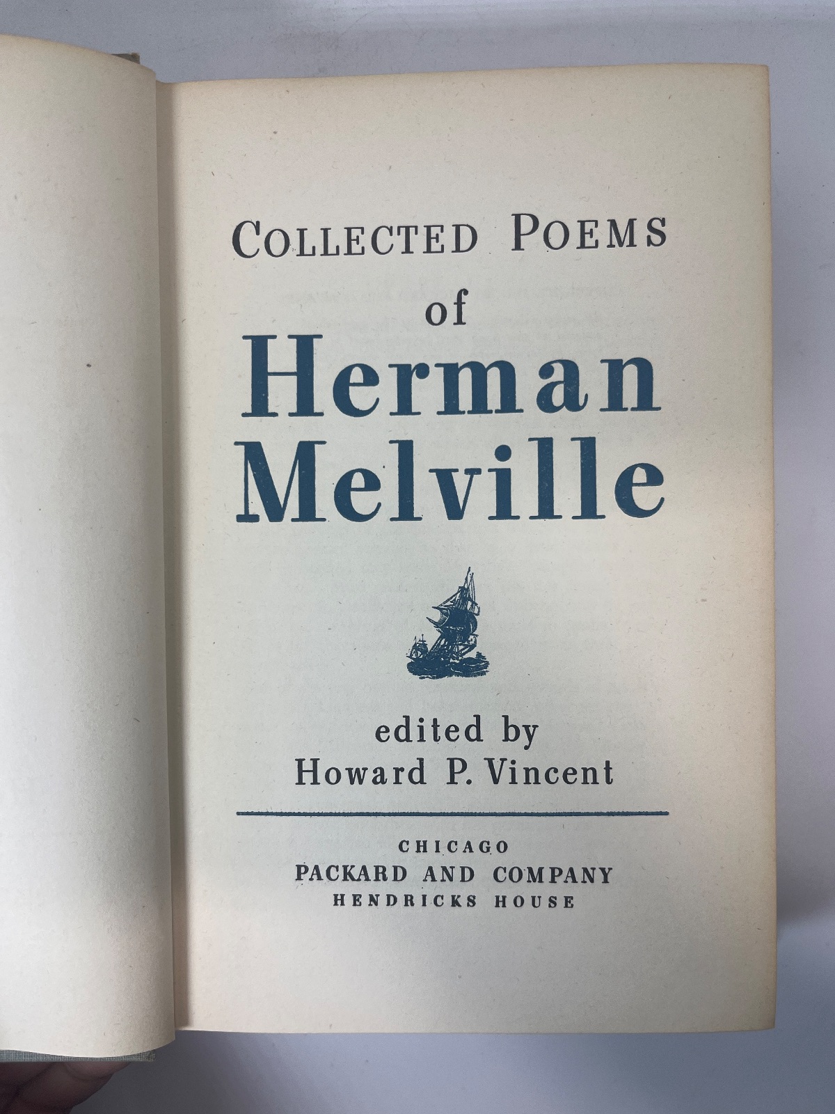 Explore Herman Melville’s poetic genius in this 1947 edition of “Collected Poems,” published by Packard and Company. Edited by Howard P. Vincent, this hardcover is in good condition, with some spine wear and an Ex Libris sticker from Lester Moses. A rare literary treasure for collectors and poetry lovers alike.