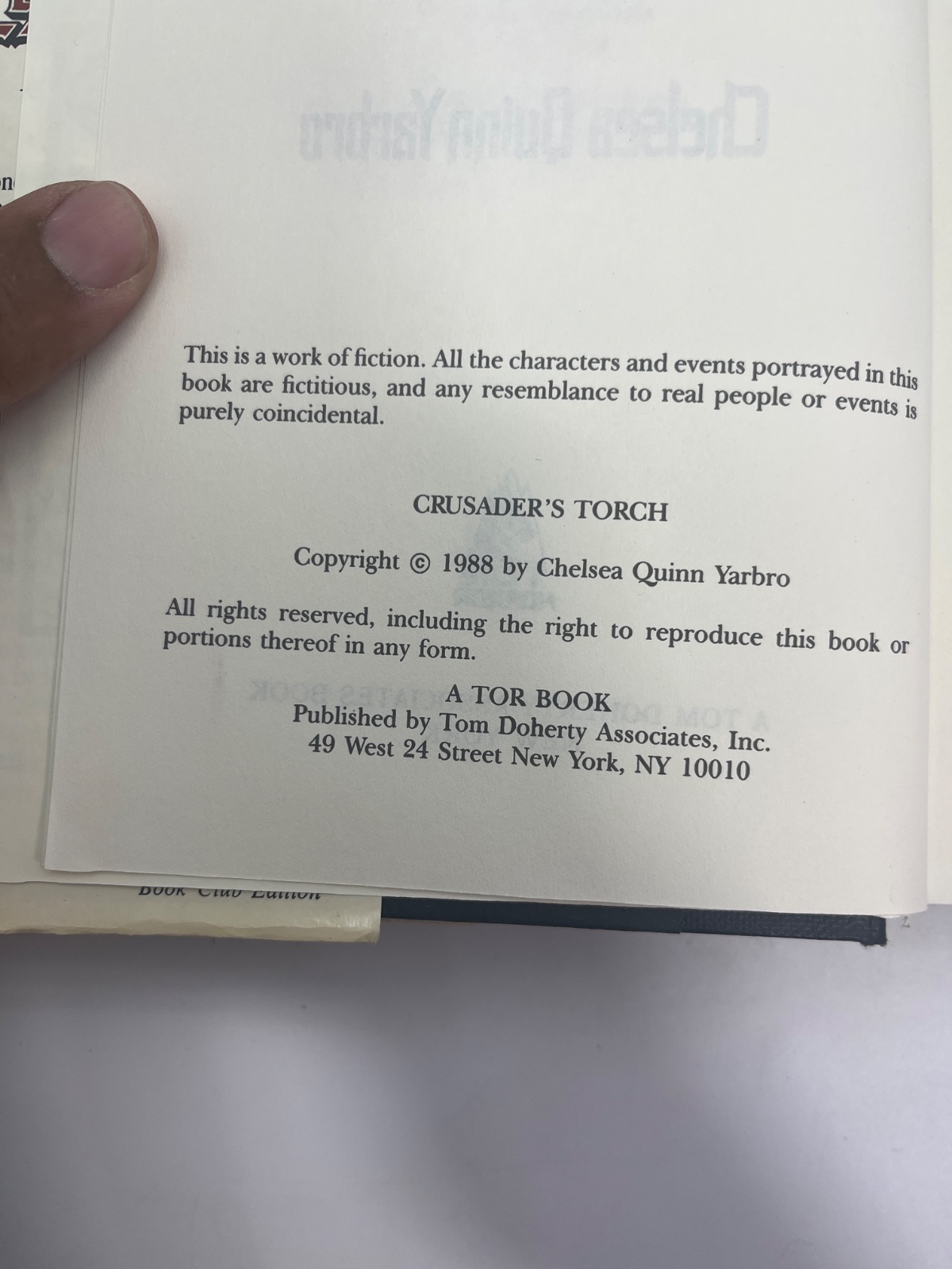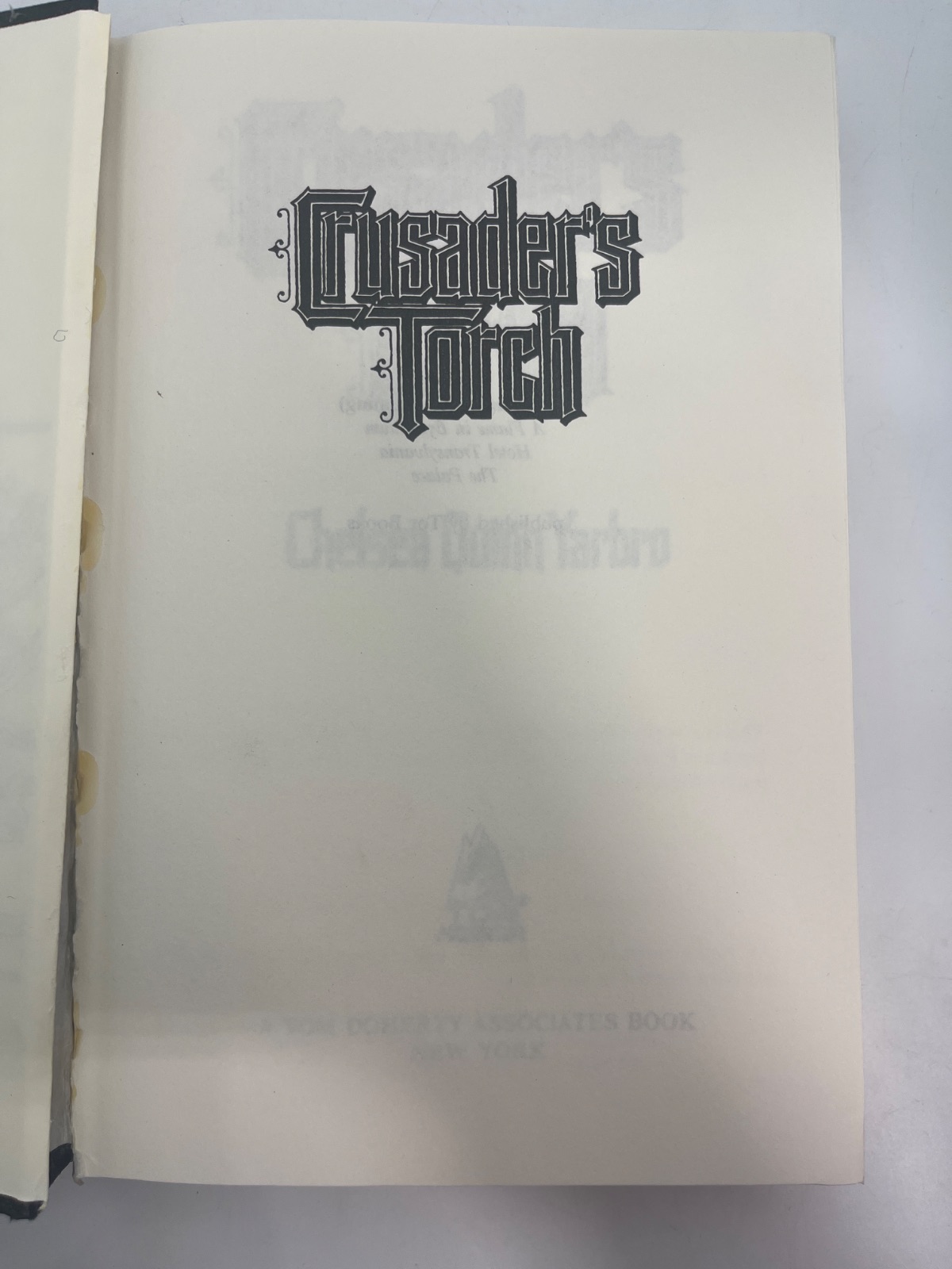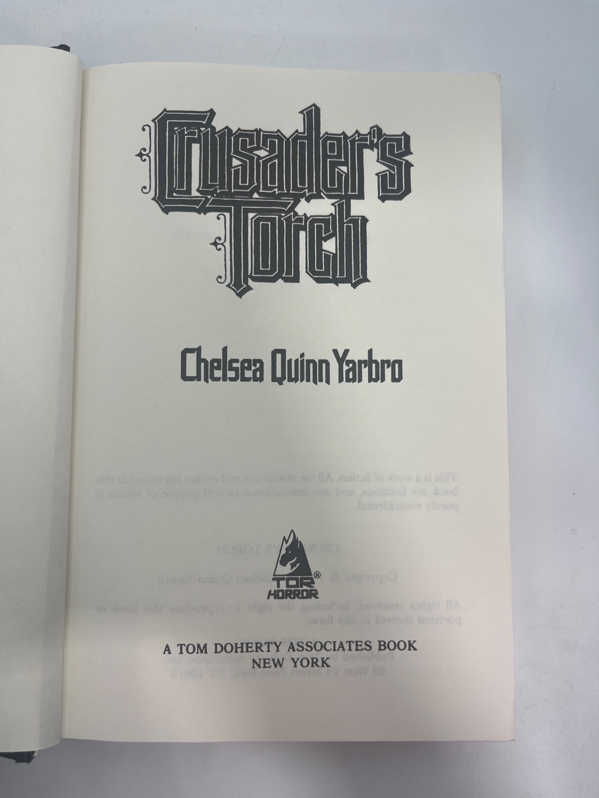 “Crusader’s Torch” by Chelsea Quinn Yarbro is a 1988 historical horror novel published by Tom Doherty Associates. Set during the Crusades, it blends medieval adventure with supernatural elements. The dust jacket is worn with edge tears, but the book remains in good reading condition. A must-have for fans of historical fiction and horror.