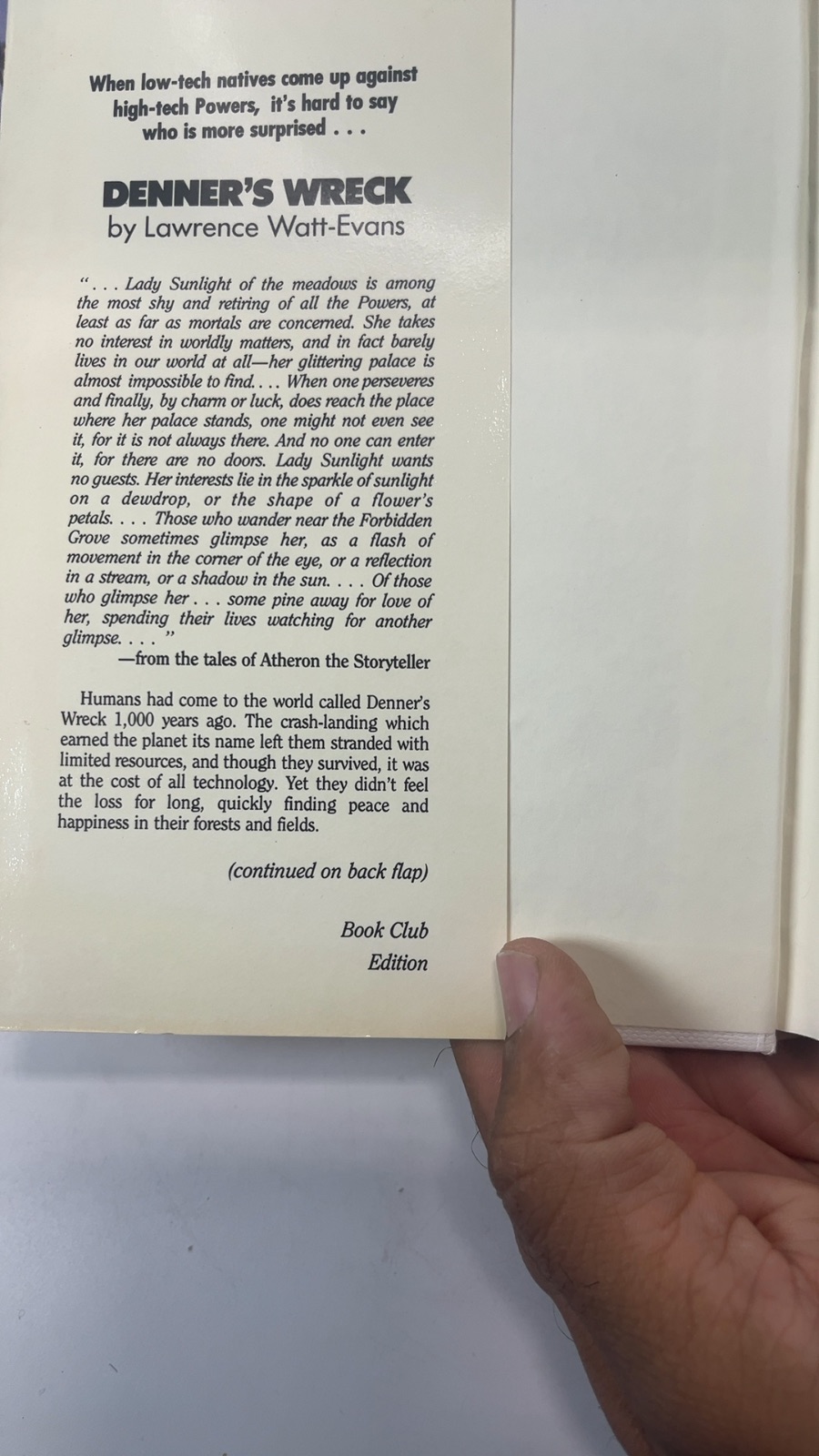 Step into a world where low-tech natives meet high-tech powers in Lawrence Watt-Evans’ intriguing novel, “Denner’s Wreck.” This captivating tale unfolds on a planet named after a crash-landing that left its human inhabitants stranded with limited resources. A thousand years later, these settlers have found peace amidst their forests and fields, unaware of the technological marvels that once defined their existence. At the heart of the story is Lady Sunlight, a mystical figure whose presence is as elusive as it is enchanting. Her palace, shimmering and almost impossible to find, symbolizes the mysteries and magic that permeate this extraordinary world. Published by Avon Books in 1988, this Book Club Edition is a must-have for fans of science fiction and fantasy, offering a unique blend of adventure and wonder.