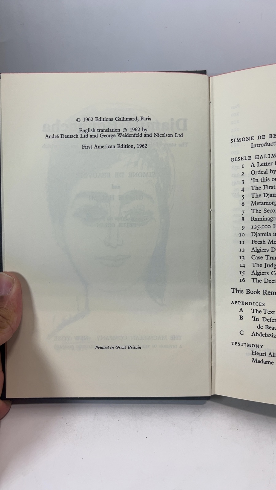 “Djamila Boupacha” is a powerful testament to the resilience of the human spirit, co-authored by the eminent Simone de Beauvoir and Gisele Halimi. This first American edition, published in 1962 by The Macmillan Company, delves into the harrowing story of Djamila Boupacha, a young Algerian woman whose torture by French authorities during the Algerian War became a symbol of the struggle against colonial oppression. Through meticulous documentation and impassioned narrative, Beauvoir and Halimi illuminate the broader issues of human rights and feminism, making this work not only a biography but also a political statement that resonates with contemporary readers. This edition is a must-have for collectors and those interested in historical narratives of resistance and justice.