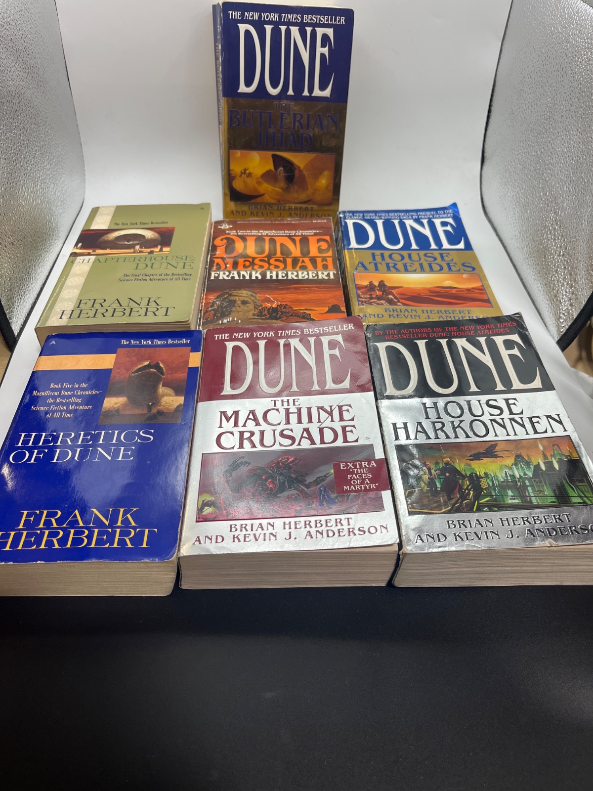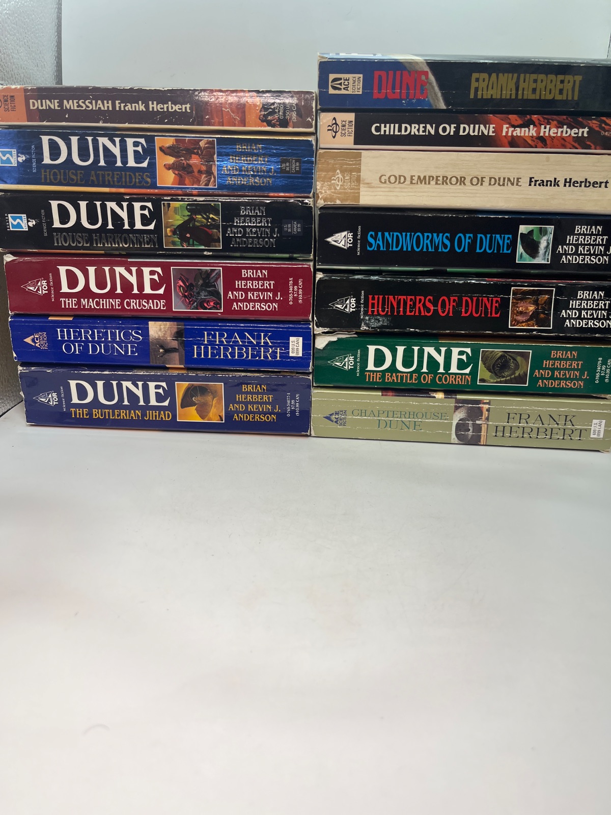 Explore the Dune universe with this mixed lot of 13 books, including Frank Herbert’s original classics and the expanded series by Brian Herbert and Kevin J. Anderson. This collection covers the epic saga of Arrakis, the spice, and the interstellar power struggles. Featuring typical wear from reading, these paperbacks are perfect for fans of science fiction. ISBN 0-441-17271-7 visible on “Dune.”