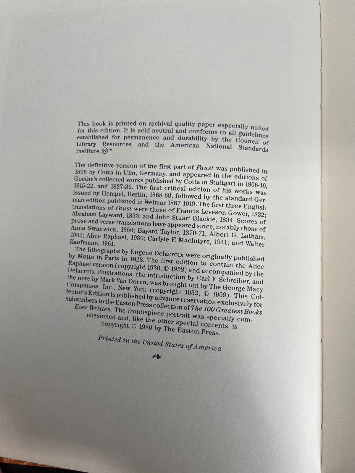 Delve into the timeless tale of ambition, desire, and redemption with Johann Wolfgang von Goethe’s “Faust,” presented in a luxurious Collector’s Edition by The Easton Press. This masterpiece, translated into modern English by Alice Raphael, is enriched with the evocative lithographs of Eugene Delacroix, capturing the essence of Goethe’s dramatic narrative. Bound in genuine leather with intricate gold embossing, this edition is part of The 100 Greatest Books Ever Written series. It offers a sublime reading experience for collectors and enthusiasts of classic literature, inviting readers to explore the profound philosophical questions and moral dilemmas that have captivated audiences for generations.