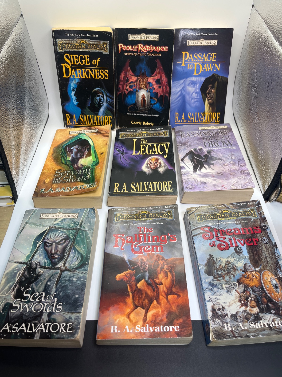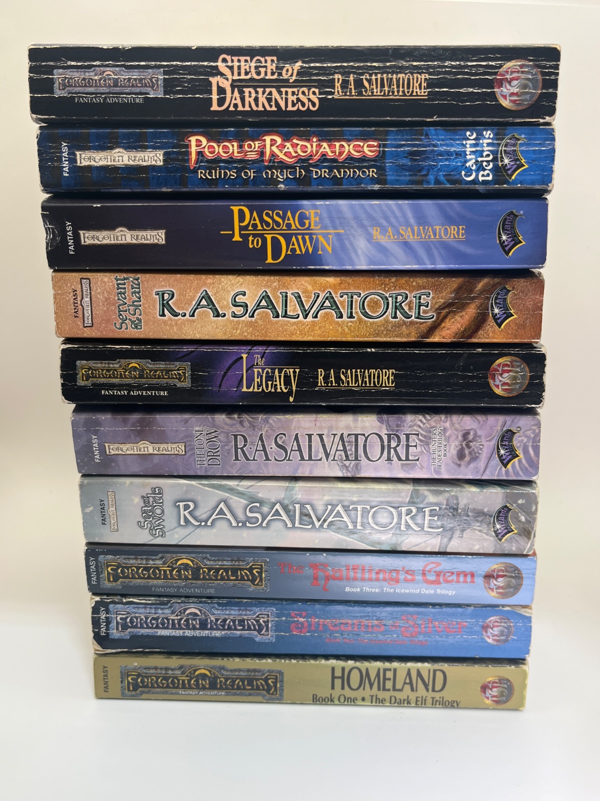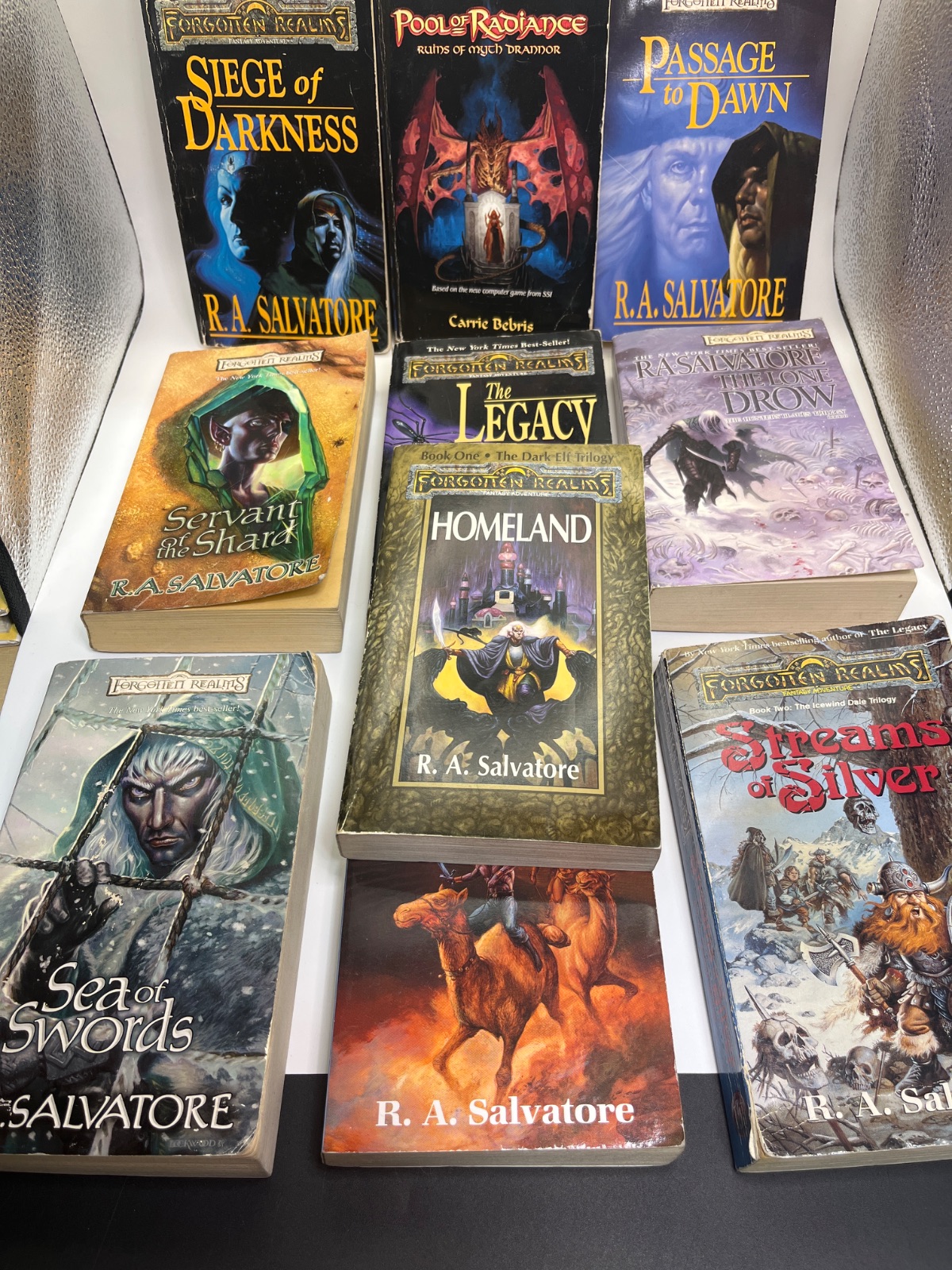 Dive into the captivating world of the Forgotten Realms with this mixed lot of 10 fantasy books by R.A. Salvatore. Known for his richly woven tales and unforgettable characters, Salvatore invites readers into the adventures of Drizzt Do’Urden, a drow with a conscience and a sword. From the epic battles in “Siege of Darkness” to the thrilling quest in “The Halfling’s Gem,” each book offers a unique glimpse into a realm where magic and intrigue abound. Whether you’re a seasoned fan or new to the series, this collection promises hours of immersive storytelling and exploration in a world where the boundaries of fantasy are pushed to their limits.