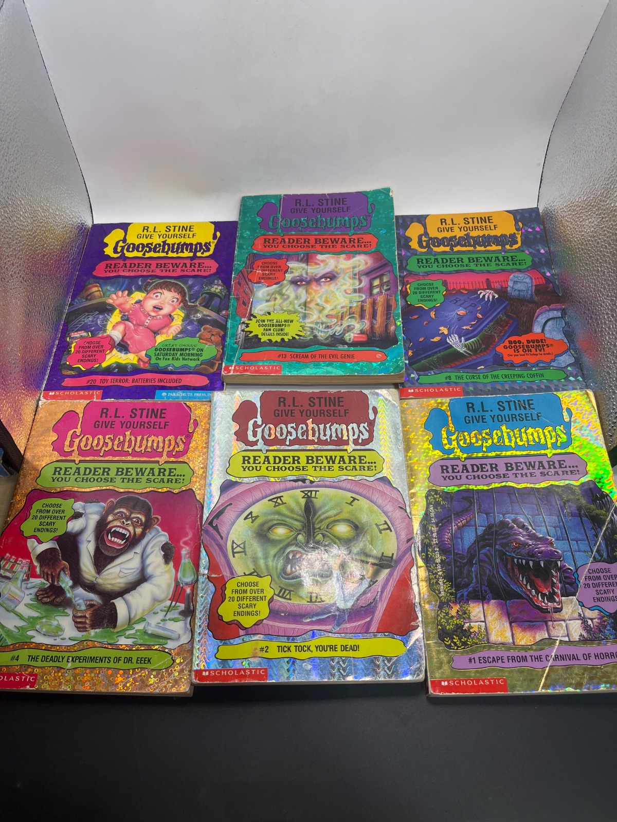 Explore the chilling adventures of R.L. Stine’s “Give Yourself Goosebumps” with this lot of six interactive horror books. Each story offers over 20 different endings, delivering unique thrills and scares. Although the covers show some wear, the bindings are intact, and the pages are free from inscriptions. Perfect for fans and collectors of this iconic 90s series. Includes titles like “Escape from the Carnival of Horrors” and “The Deadly Experiments of Dr. Eeek.”