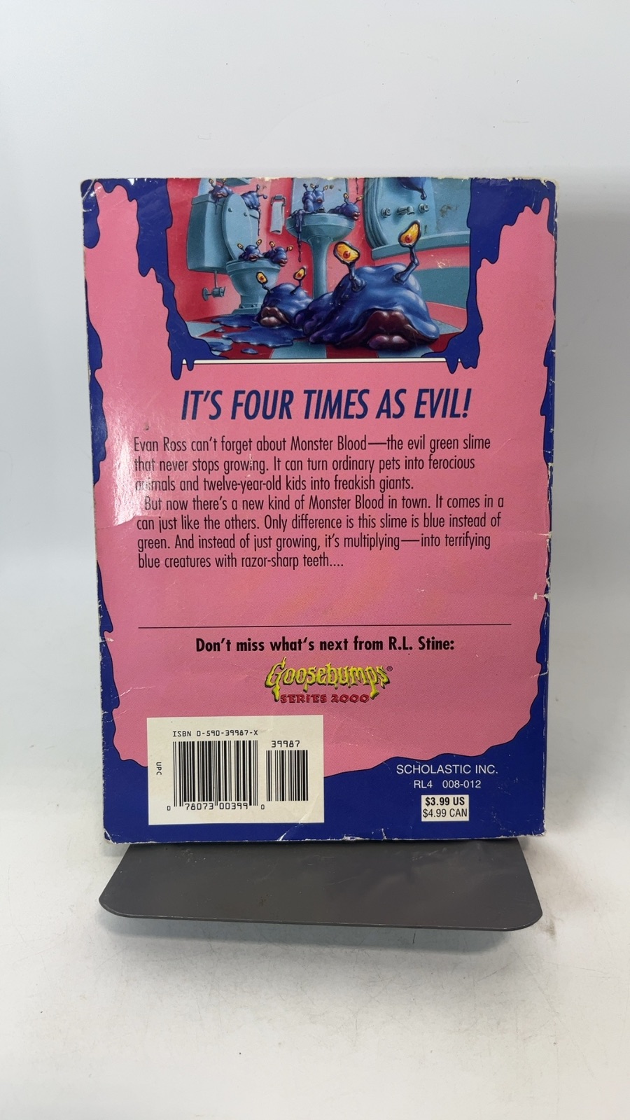 Delve into the spine-chilling world of R.L. Stine’s “Monster Blood IV,” a thrilling addition to the beloved Goosebumps series. Published by Scholastic Inc. in December 1997, this first edition paperback invites readers into a tale of terrifying transformations. Evan Ross can’t escape the nightmare of Monster Blood, an eerie blue slime that multiplies into menacing creatures. This time, the stakes are higher as the slime defies the ordinary and spawns razor-sharp-toothed monsters. Perfect for young readers who crave suspense and spine-tingling adventures, “Monster Blood IV” is a must-have for collectors and fans of the Goosebumps series.