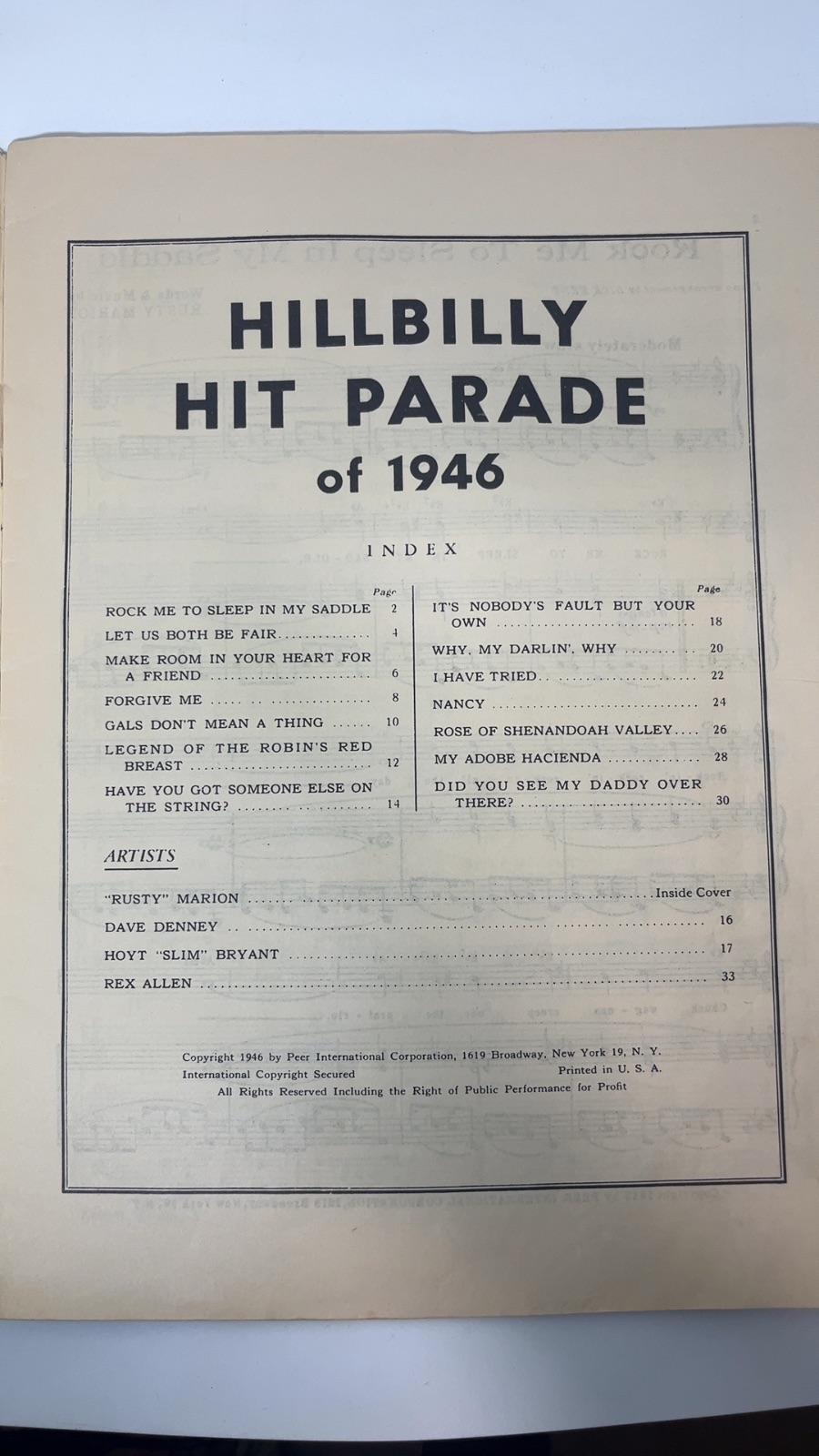 Step back in time to the golden era of country music with the “Hillbilly Hit Parade of 1946.” Published by Peer International Corporation, this collection features an array of beloved hillbilly tunes that defined a generation. With contributions from notable artists such as Rusty Marion, Dave Denney, and Hoyt “Slim” Bryant, this songbook is a treasure trove for enthusiasts and collectors alike. The book captures the spirit of post-war America, offering a nostalgic glimpse into the music that filled the airwaves and dance halls. Whether you’re a musician, historian, or country music fan, this compilation serves as a remarkable testament to the enduring charm of hillbilly music.