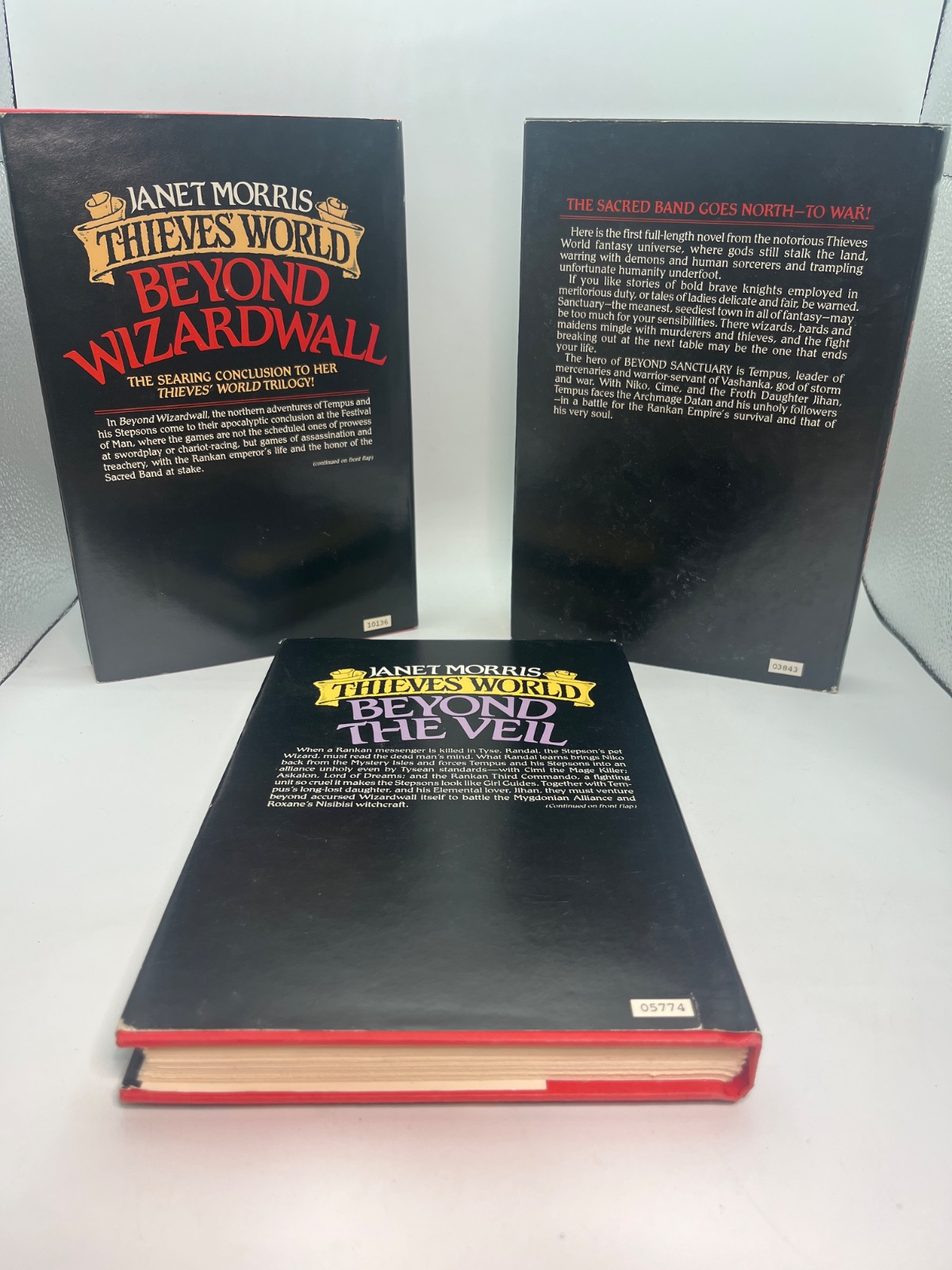 Explore the epic adventures of Thieves’ World with Janet Morris’s trilogy: Beyond Sanctuary, Beyond Wizardwall, and Beyond the Veil. Published by Baen Books, these Book Club Editions are in good condition, featuring minor wear on dust jackets. Immerse yourself in a world of gods, sorcerers, and heroic battles. A perfect collection for fantasy enthusiasts and collectors alike.