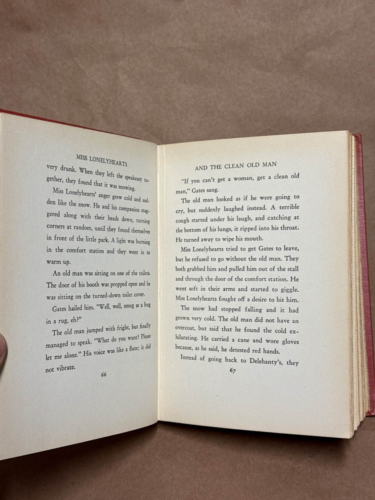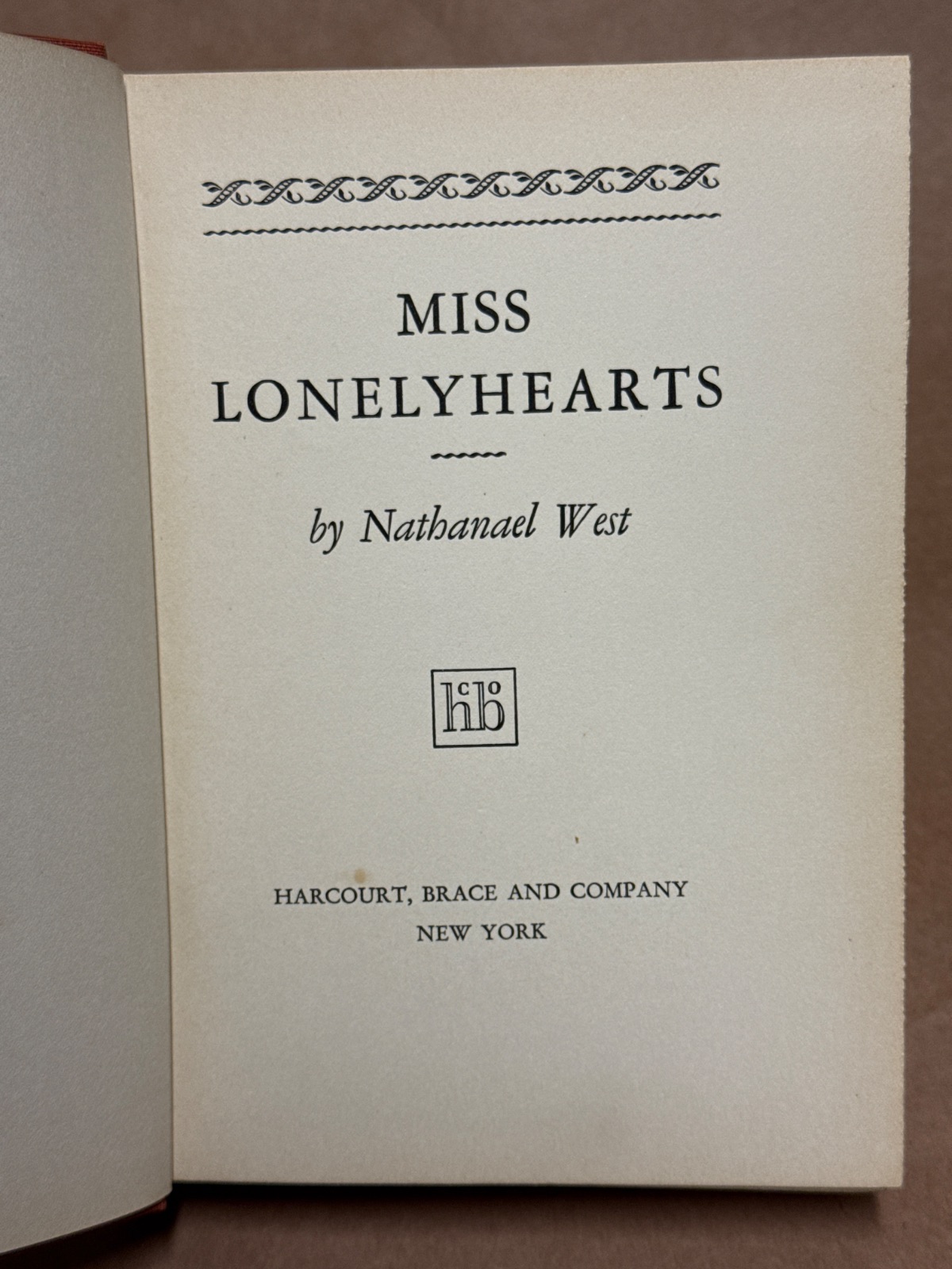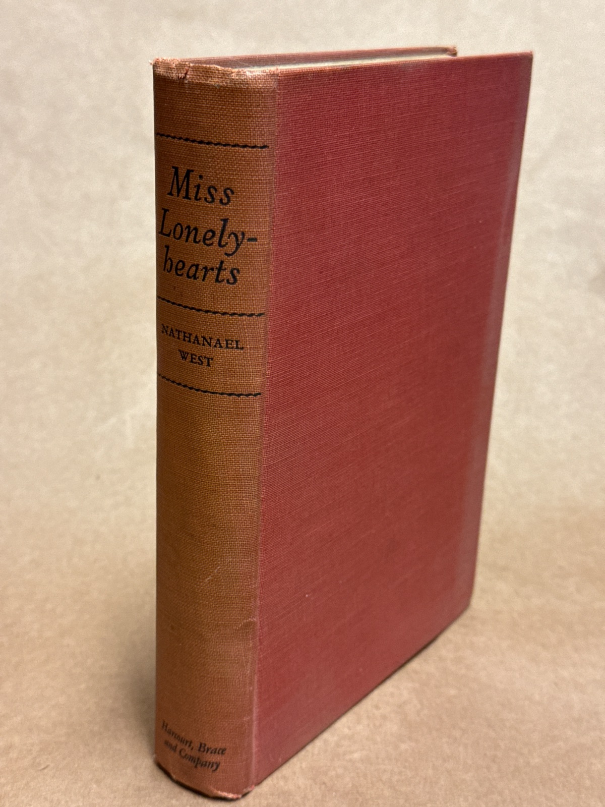 “Miss Lonelyhearts” by Nathanael West, published by Harcourt, Brace and Company in New York in 1933, is a seminal work of American fiction. This edition is bound in red cloth with the title and author embossed on the spine. Nathanael West, a pivotal figure in 20th-century literature, explores the dark undercurrents of the human psyche through the lens of an advice columnist grappling with despair. The book’s exploration of existential themes places it firmly within the satire genre, offering a critical commentary on society. This edition, lacking a dust jacket, is in solid condition with minor wear to the spine and edges. As an early publication, it holds significant value for collectors interested in classic American literature.