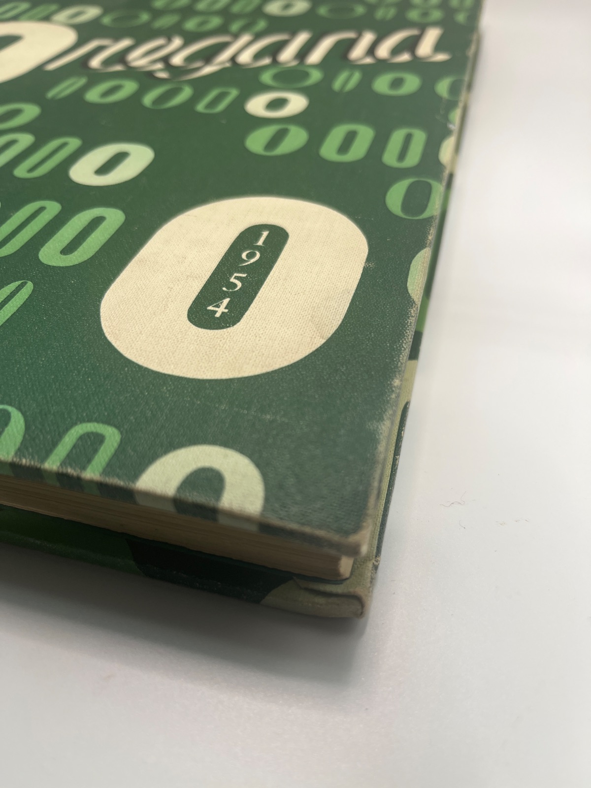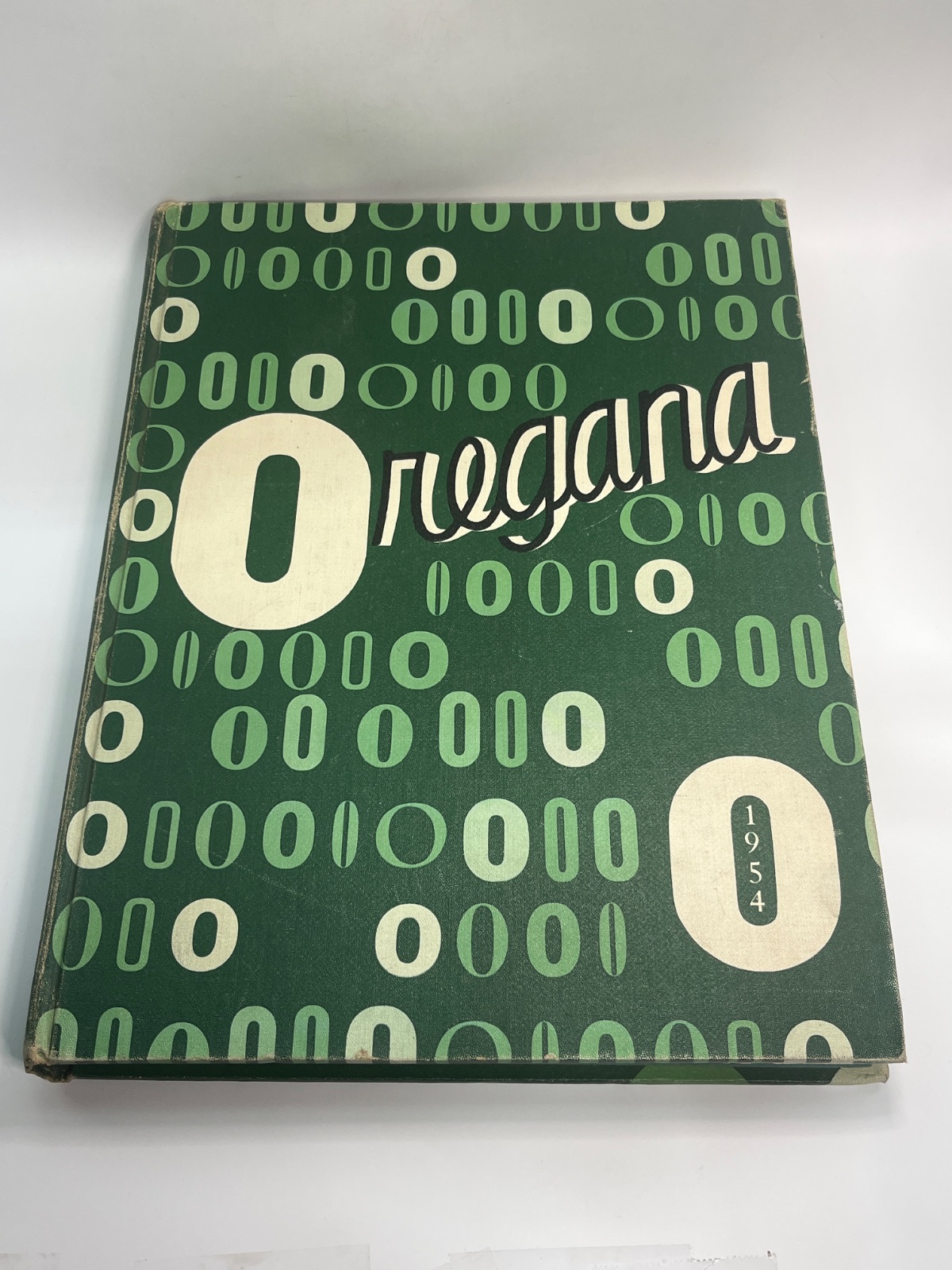 Notes The "Oregana 1954" yearbook is in good condition with some signs of wear on the cover, particularly at the corners and edges. There is no dust jacket, and the spine shows minor rubbing. Inside, there is a handwritten inscription, adding a personal touch to this historical artifact. The pages are well-preserved, reflecting the care taken over the years.