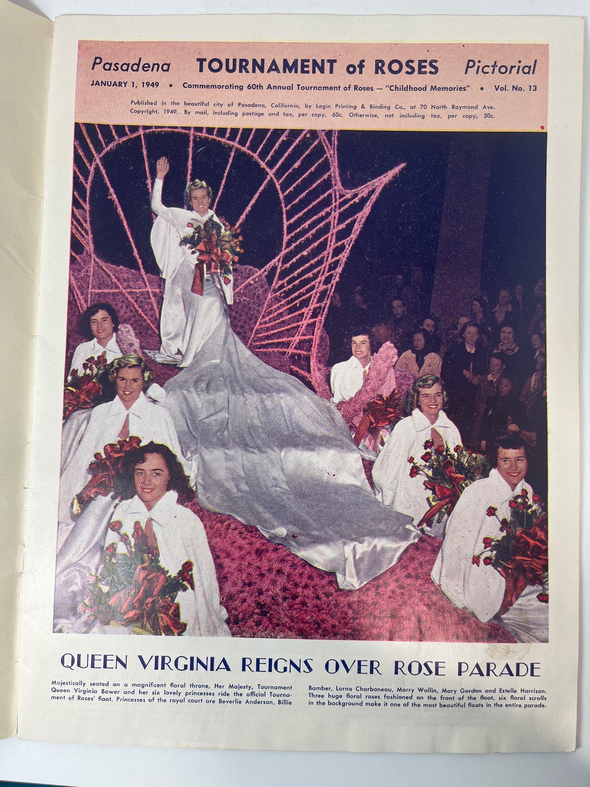 Dive into the vibrant history of the Pasadena Tournament of Roses with this 1949 pictorial edition. Commemorating the 60th annual event, this publication is a visual feast, capturing the grandeur and pageantry of one of America’s most beloved parades. Published by Login Printing & Binding Co. in Pasadena, California, this edition features stunning photographs and details of the floats, participants, and the crowned Queen Virginia Bower. A must-have for collectors and enthusiasts of American cultural traditions, this pictorial offers a nostalgic journey back to a time when community spirit and creativity bloomed on the streets of Pasadena. Immerse yourself in the beauty and tradition of the Rose Parade with this historical keepsake.
