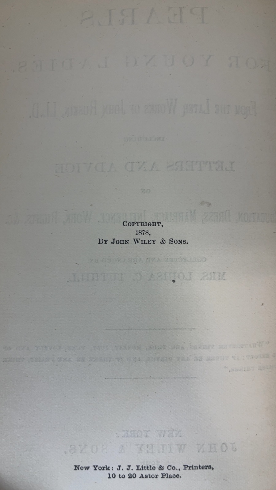 Discover the timeless wisdom of John Ruskin in “Pearls for Young Ladies,” a collection of insightful letters and advice curated by Mrs. Louisa C. Tuthill. Published in 1887 by John Wiley & Sons, this volume offers guidance on education, dress, marriage, influence, work, and rights, making it an essential read for young women of the era. Ruskin’s eloquent prose and Tuthill’s thoughtful arrangement provide a fascinating glimpse into the societal expectations and aspirations of the late 19th century. This book is a treasure trove of historical and cultural significance, appealing to collectors and enthusiasts of women’s studies and historical literature.