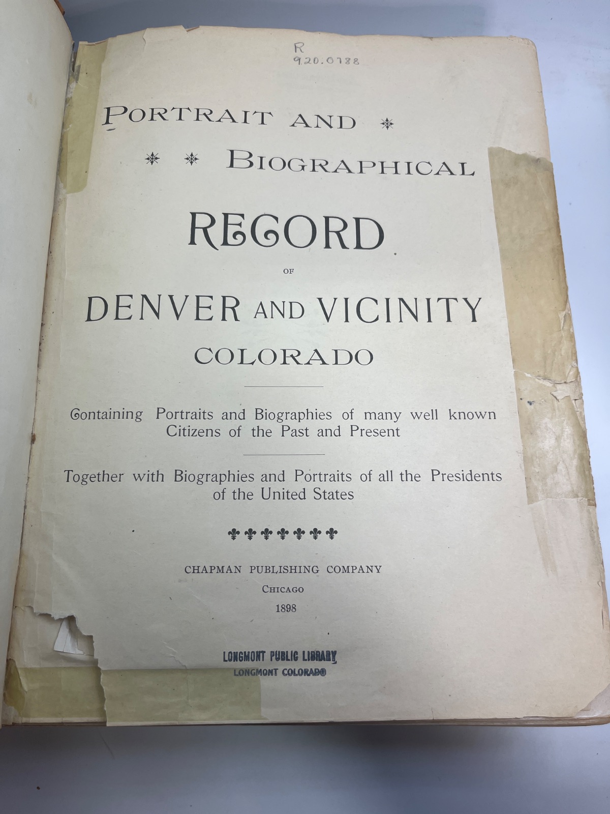 Explore Denver’s rich history with the 1898 “Portrait and Biographical Record of Denver and Vicinity Colorado” by Chapman Publishing Company. This rare volume features detailed portraits and biographies of notable citizens and U.S. Presidents. The book, showing significant wear and library markings, is a unique find for collectors and history enthusiasts.