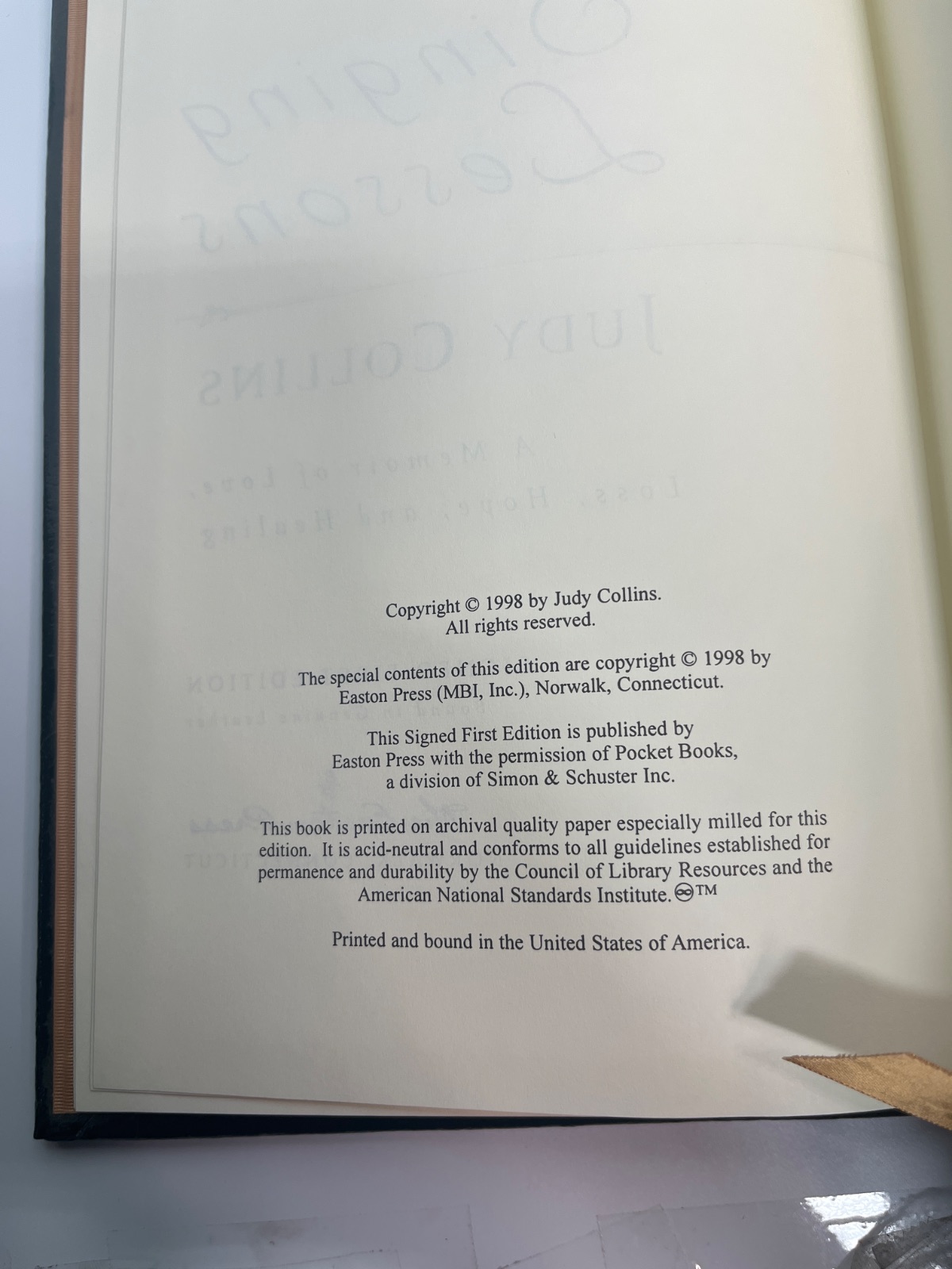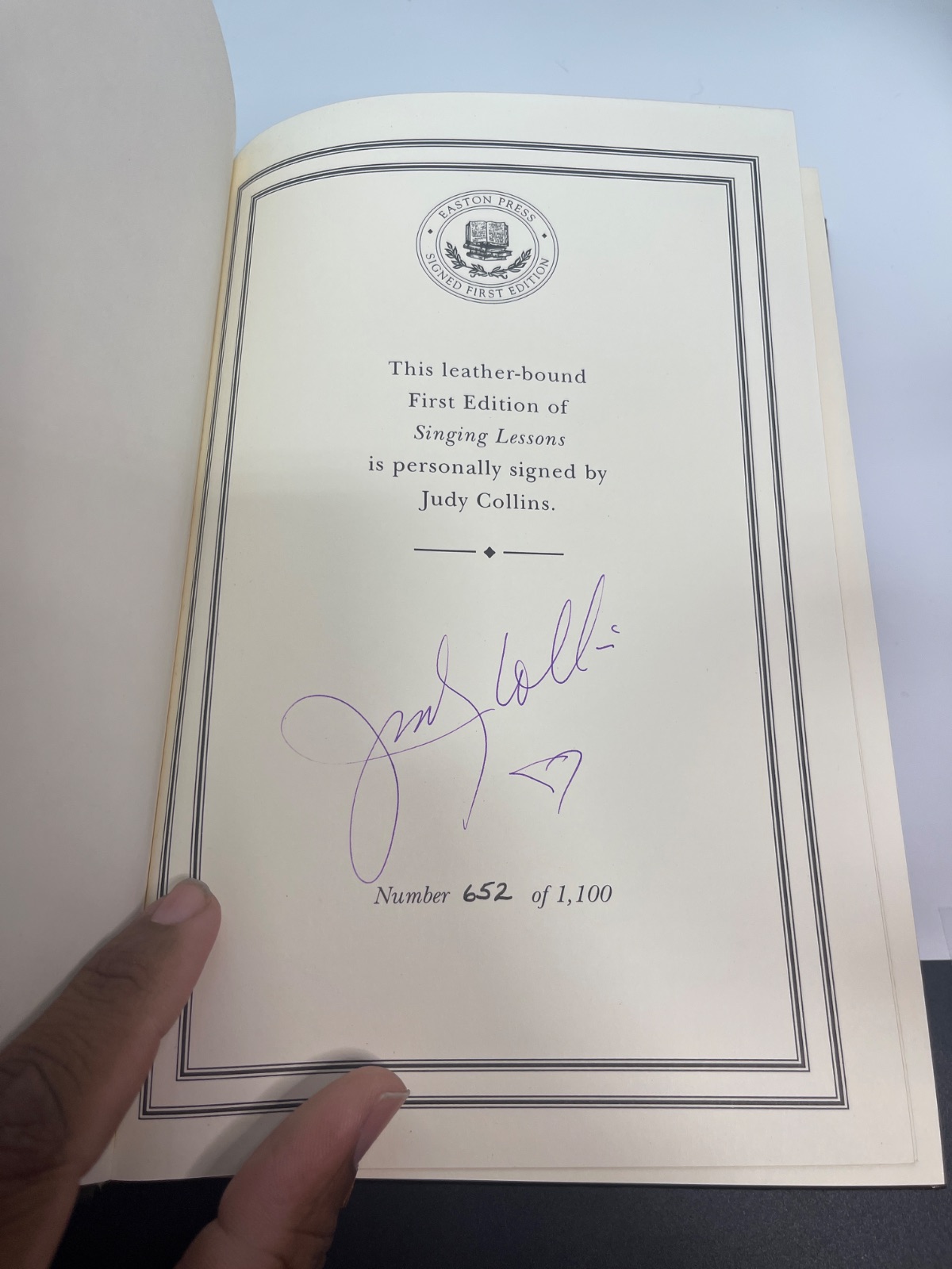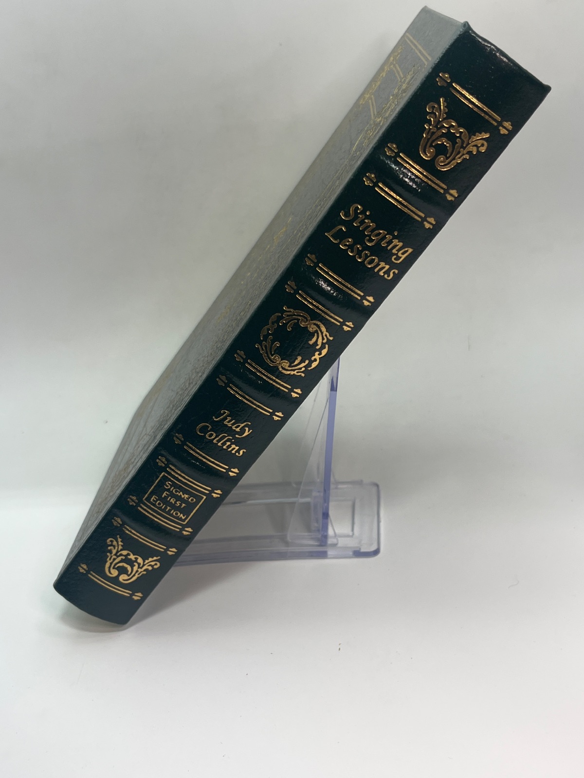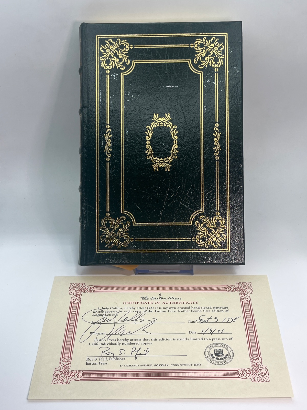 “Singing Lessons” by Judy Collins is a beautifully crafted memoir that delves into the profound experiences of love, loss, hope, and healing. This leather-bound edition by Easton Press is a testament to the artistry and depth of Collins’ reflections on her life and career in music. Signed by the author, this first edition offers a personal touch, inviting readers into the intimate world of one of the most iconic voices of our time. The book is a captivating journey through the challenges and triumphs that shaped Collins’ life, making it a valuable addition to any collection of music or memoir literature.