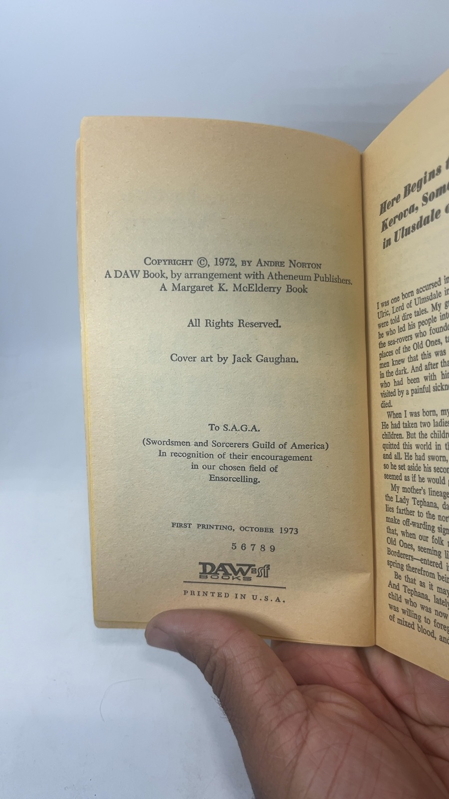 Step into the enchanting world of Andre Norton’s “The Crystal Gryphon,” a captivating tale set in the same universe as her acclaimed Witch World series. This first printing edition, released in October 1973, invites readers into the life of Kerovan, a young man of mysterious heritage. As sea invaders threaten the stability of ancient kingdoms, Kerovan embarks on a quest that intertwines with the enigmatic forces of the Old Ones. With cover art by Jack Gaughan, this DAW Books publication is a must-have for collectors and fantasy enthusiasts alike. Norton’s spellbinding narrative delivers a rich tapestry of suspense and adventure, making it an essential addition to any library of speculative fiction.