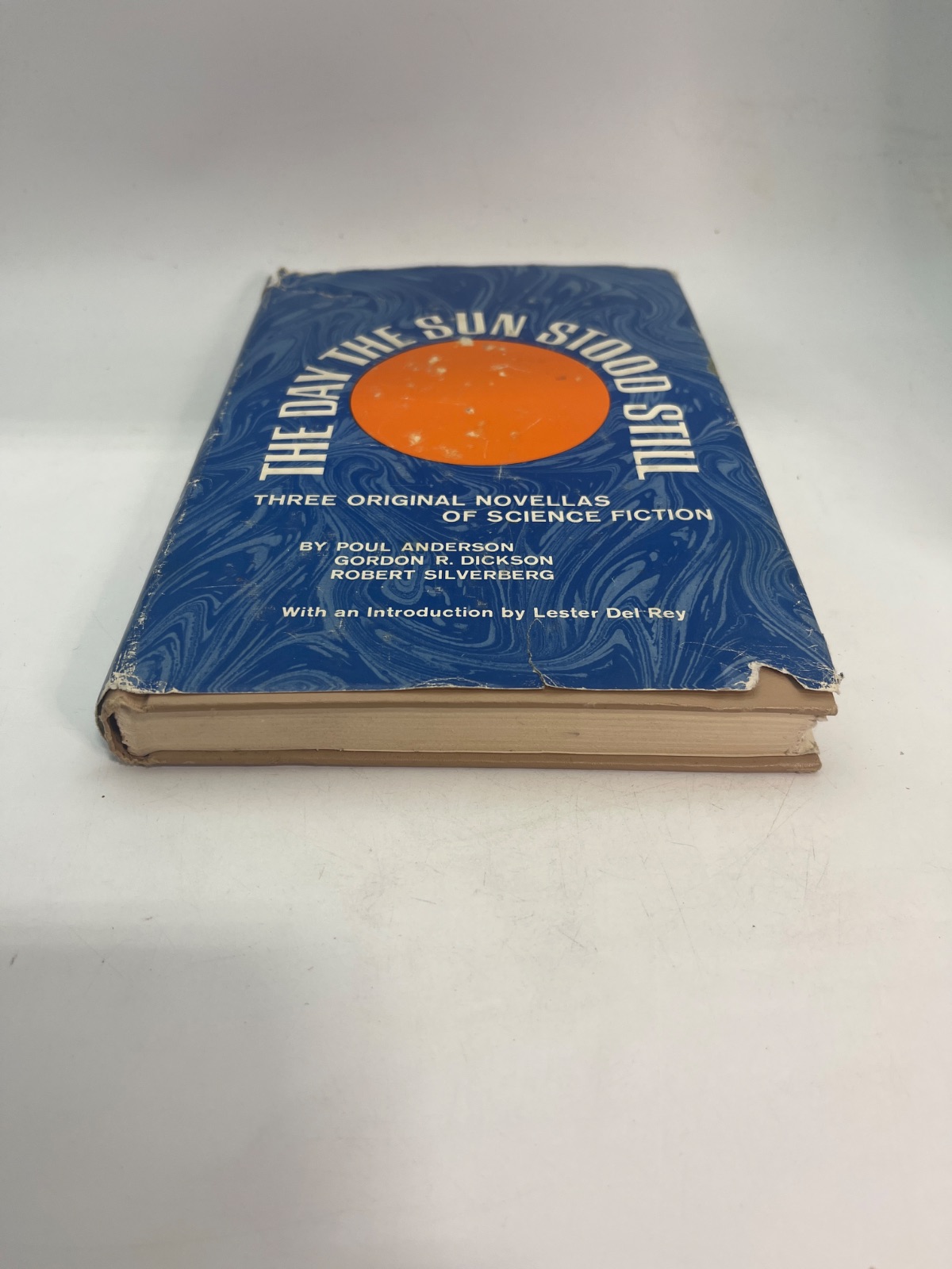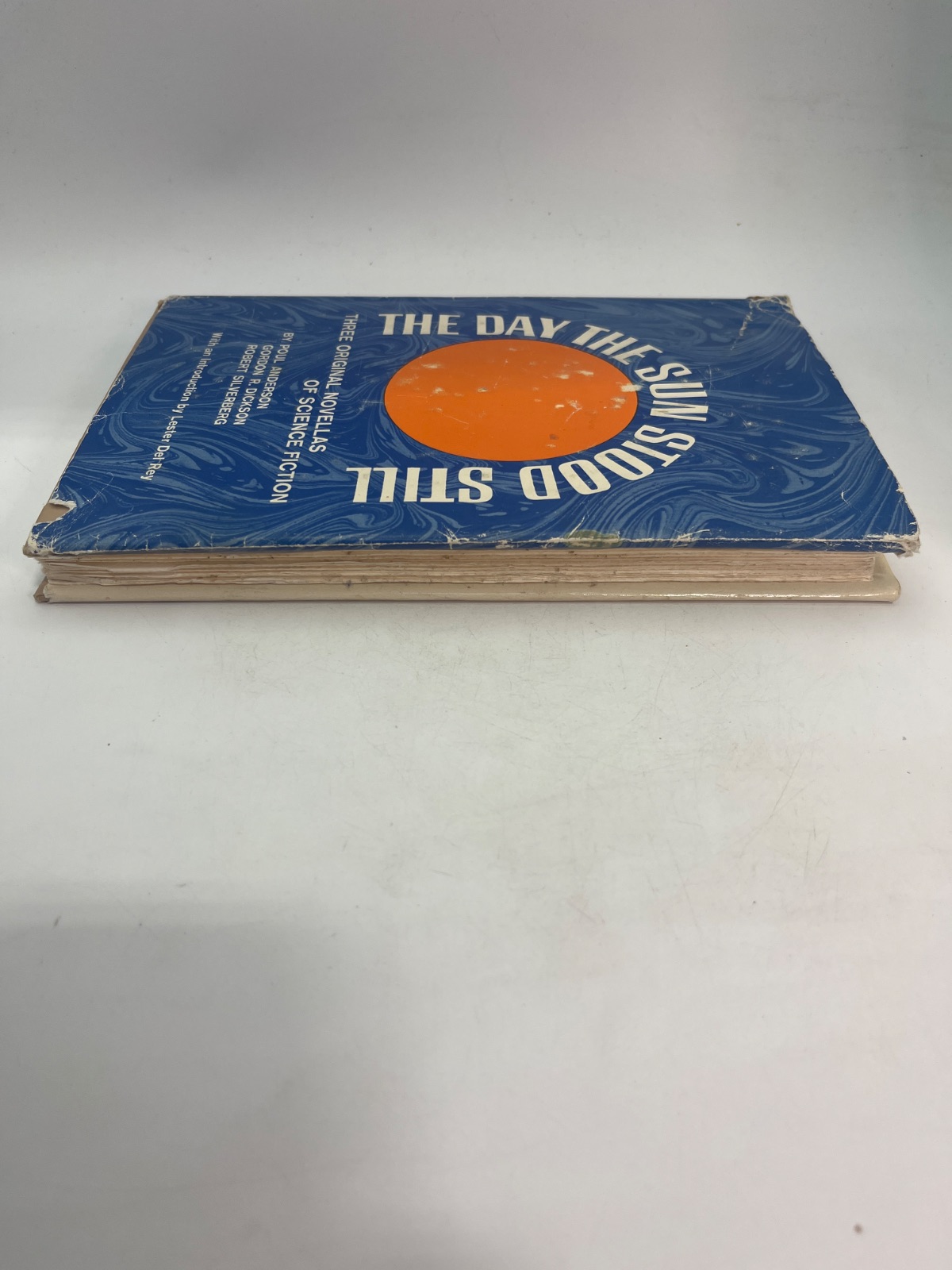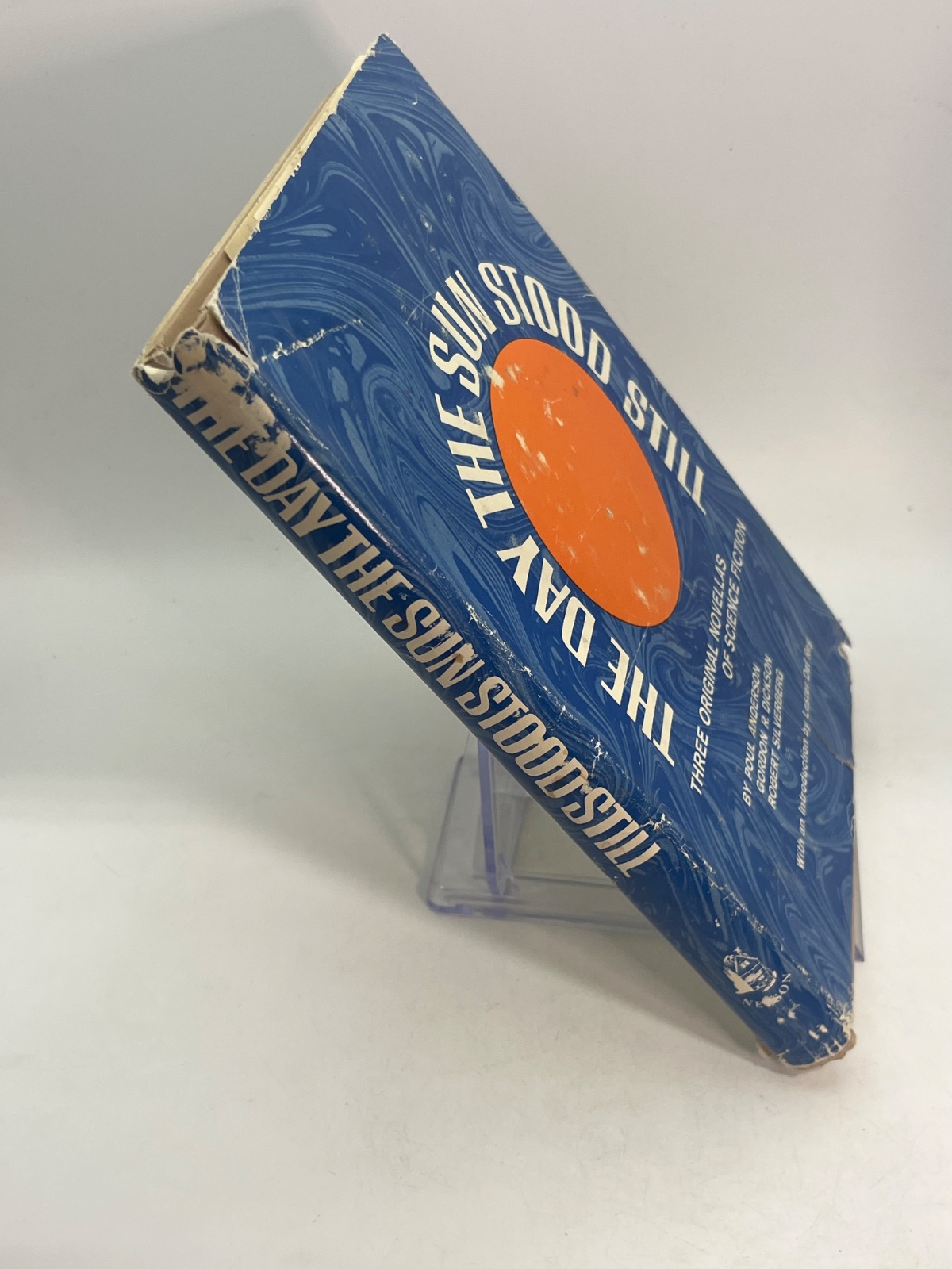 “The Day the Sun Stood Still” (1972) features novellas by Poul Anderson, Gordon R. Dickson, and Robert Silverberg. Published by Thomas Nelson Inc., this science fiction anthology includes an introduction by Lester del Rey. The dust jacket is worn with edge tears, but the interior remains clean. A must-have for collectors and fans of classic sci-fi storytelling.