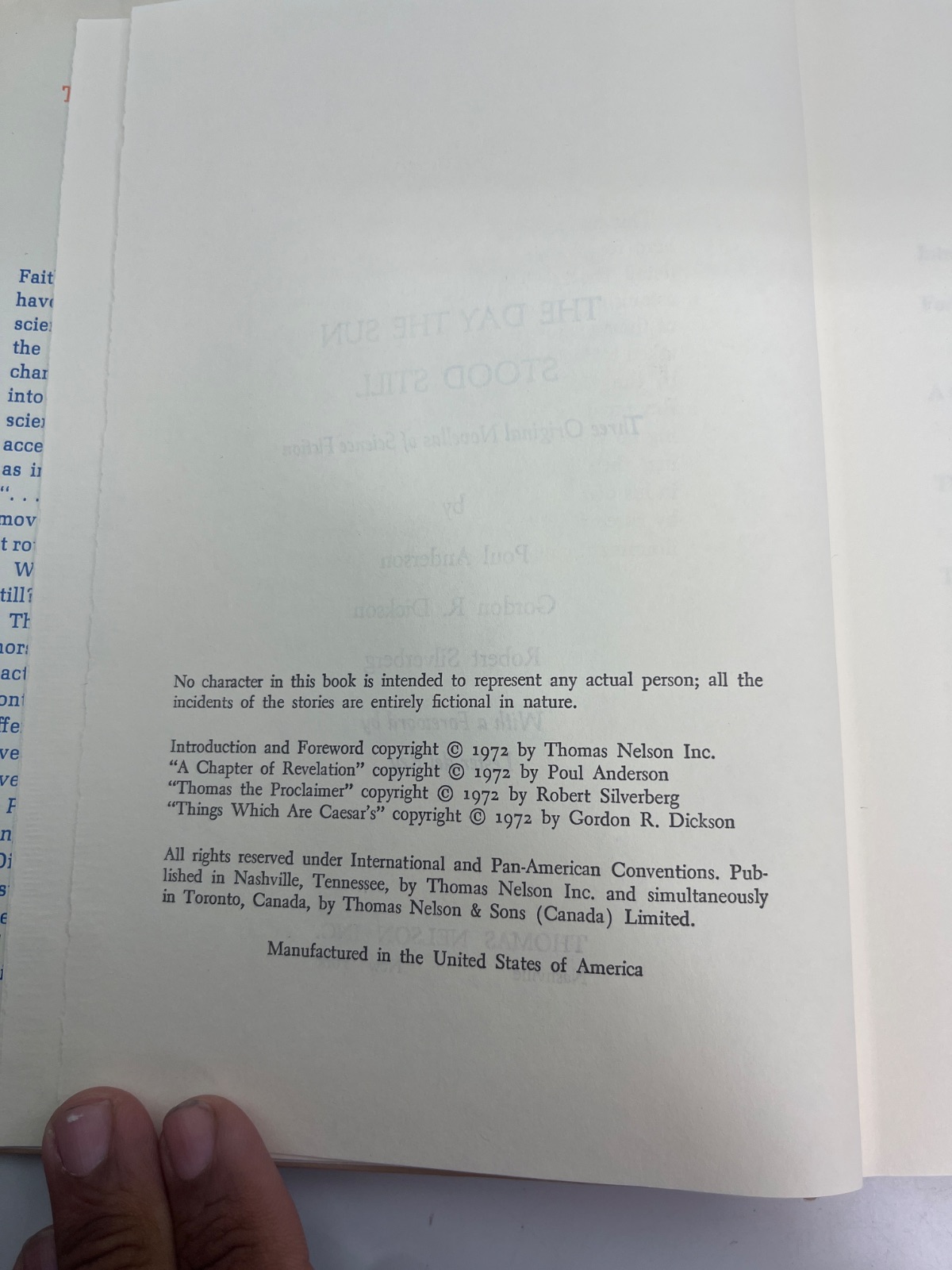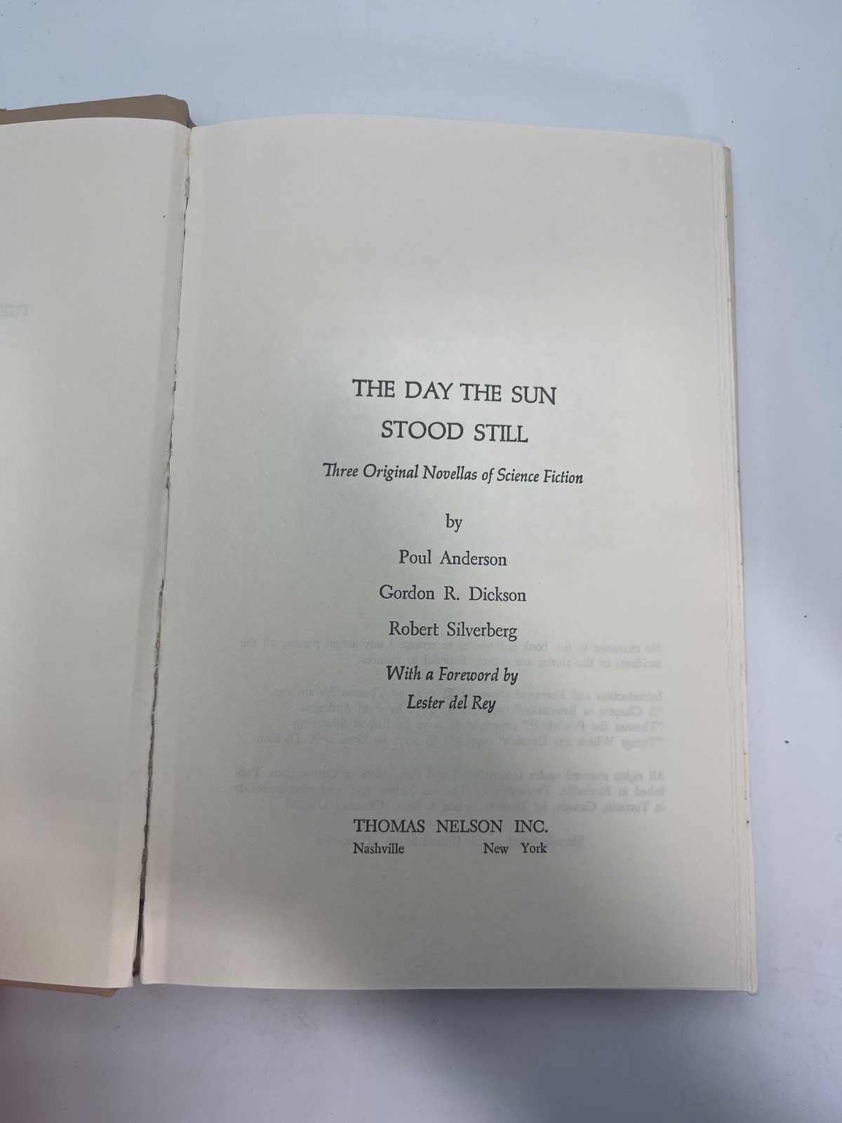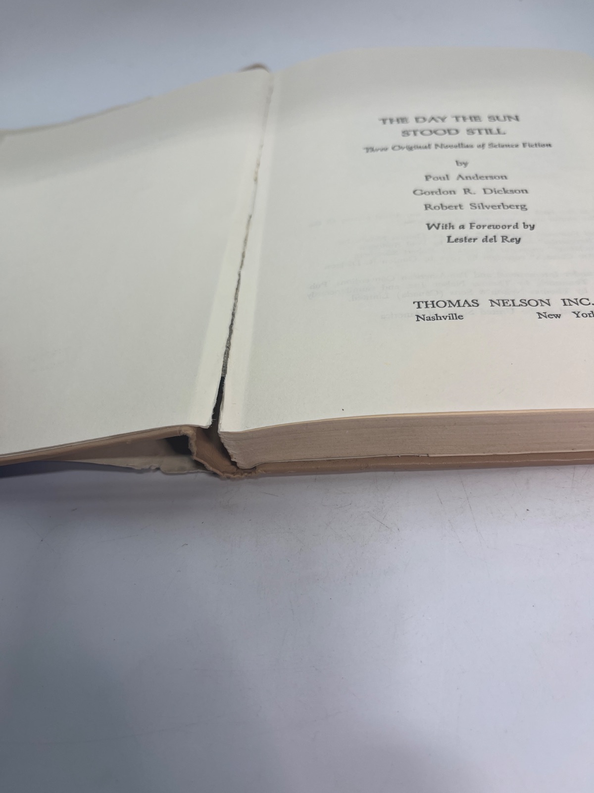 “The Day the Sun Stood Still” (1972) features novellas by Poul Anderson, Gordon R. Dickson, and Robert Silverberg. Published by Thomas Nelson Inc., this science fiction anthology includes an introduction by Lester del Rey. The dust jacket is worn with edge tears, but the interior remains clean. A must-have for collectors and fans of classic sci-fi storytelling.
