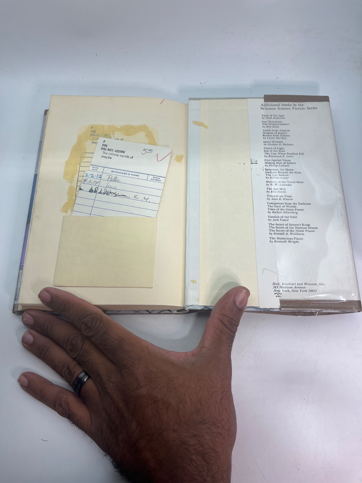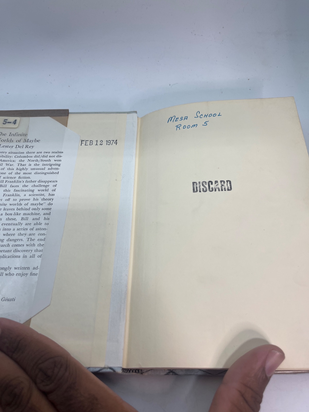 Notes This copy of "The Infinite Worlds of Maybe" is in good condition, featuring a dust jacket with some wear typical of library editions. The cover shows minor markings, and the book bears library stamps and an inscription from Mesa School Room 5. Despite these, the binding remains intact, and the pages are clean, making it a valuable find for collectors of vintage science fiction.