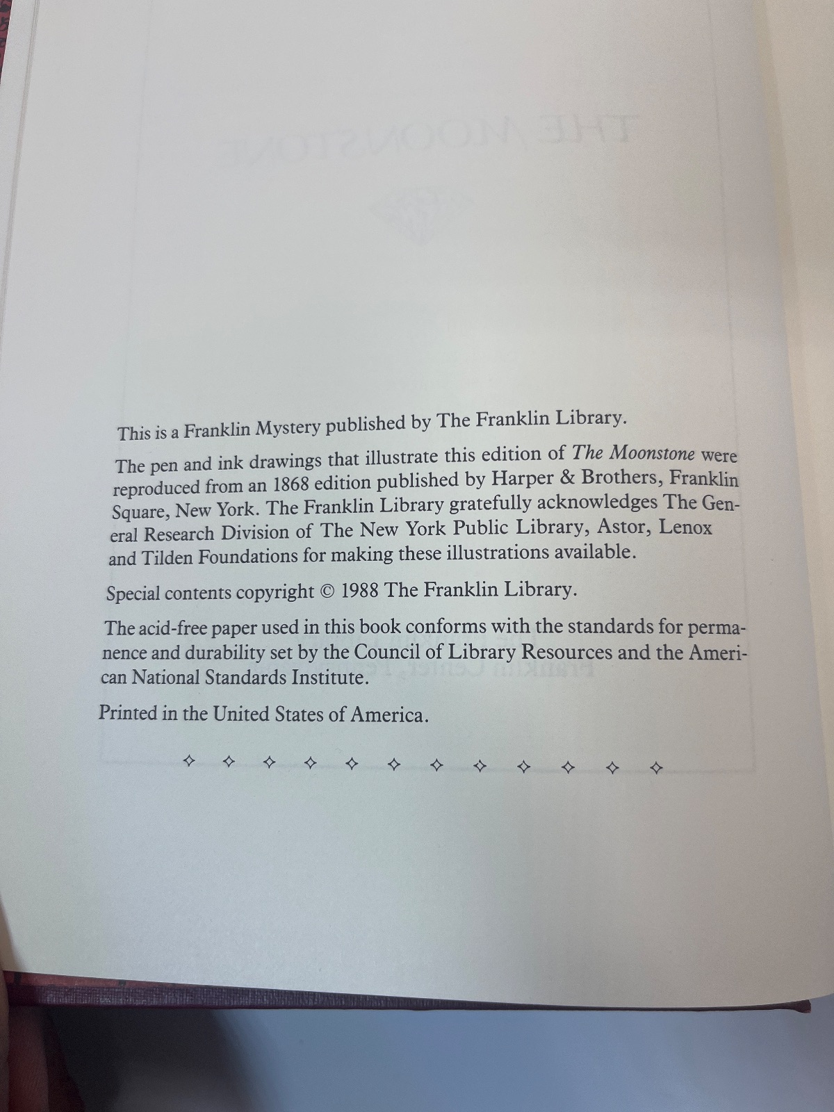 Immerse yourself in the world of Victorian mystery with Wilkie Collins’ “The Moonstone,” a cornerstone of detective fiction. Published by The Franklin Library in 1988, this edition brings to life the thrilling tale of a cursed diamond and the ensuing chaos it causes among an aristocratic family. Revered as one of the first detective novels in English literature, “The Moonstone” is celebrated for its intricate plot and multiple narrators, each adding a unique perspective to the unfolding mystery. This Franklin Mystery edition is a collector’s gem, featuring a beautifully designed cover with ornate gold detailing that captures the essence of 19th-century elegance. Perfect for both collectors and fans of classic literature, this edition offers a timeless reading experience.