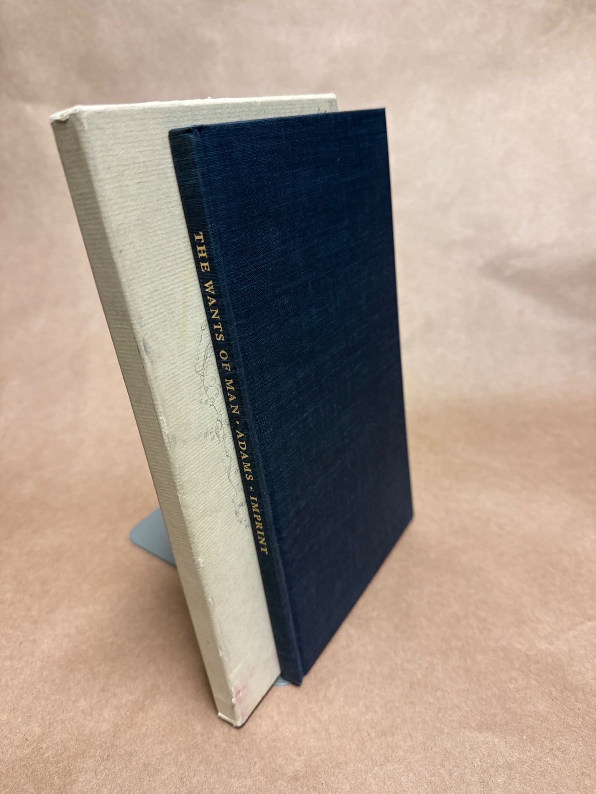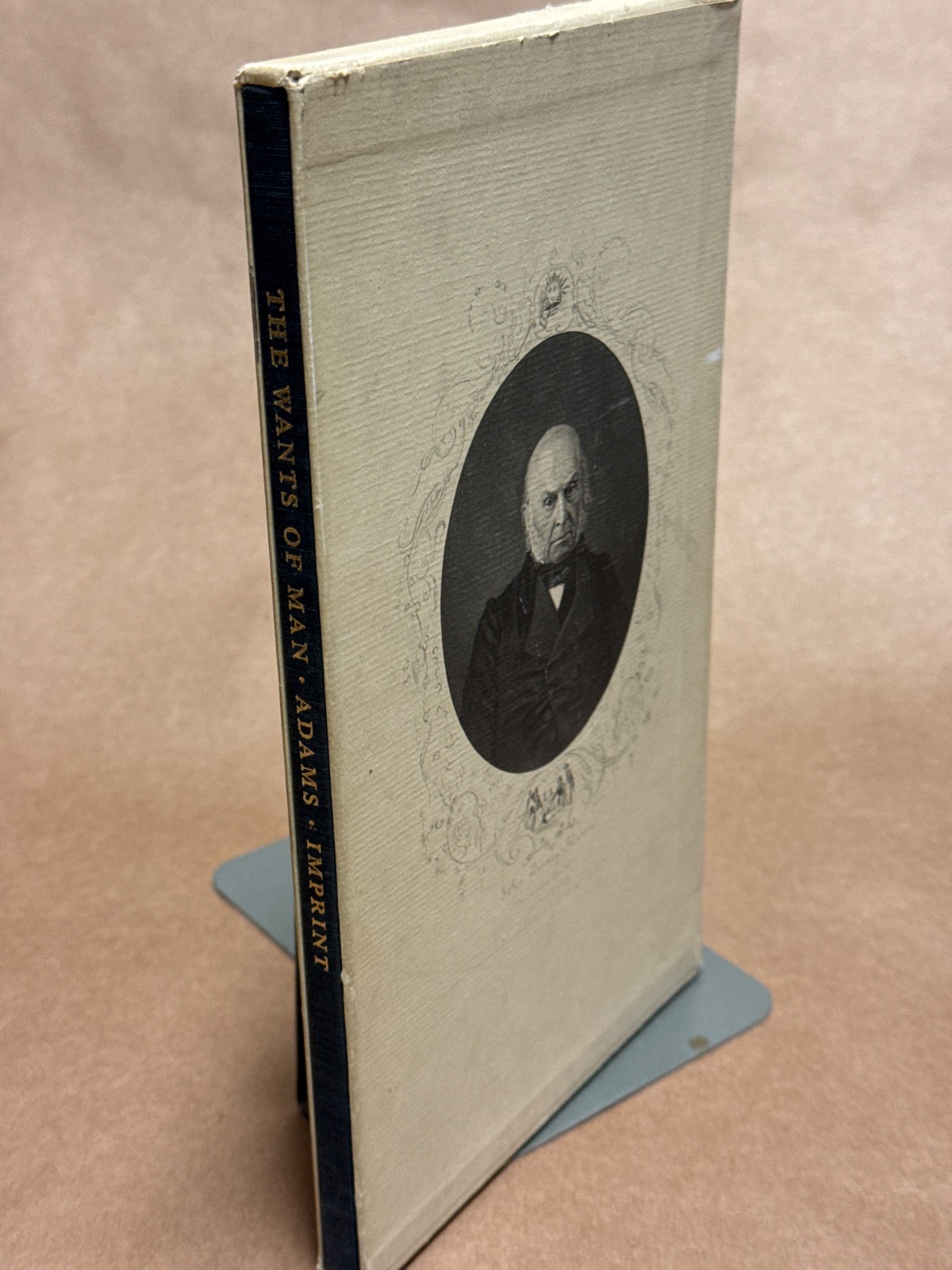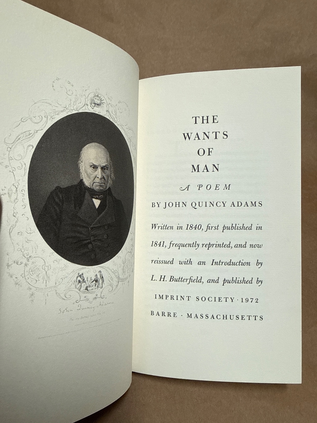 “The Wants of Man: A Poem” by John Quincy Adams, published by the Imprint Society in 1972, is a reissued edition of this historical work. Originally written in 1840 and first published in 1841, this edition includes an introduction by L. H. Butterfield, offering insights into Adams’ poetic exploration of human desires. John Quincy Adams, the sixth President of the United States, brings his intellectual prowess to this reflective piece, making it a significant addition to any collection of historical poetry. This edition is bound in blue cloth and comes with a slipcase featuring a portrait of Adams, providing both aesthetic appeal and protection. The book’s condition is excellent, with only minor wear to the slipcase, making it a valuable find for collectors interested in presidential history and poetry. ###