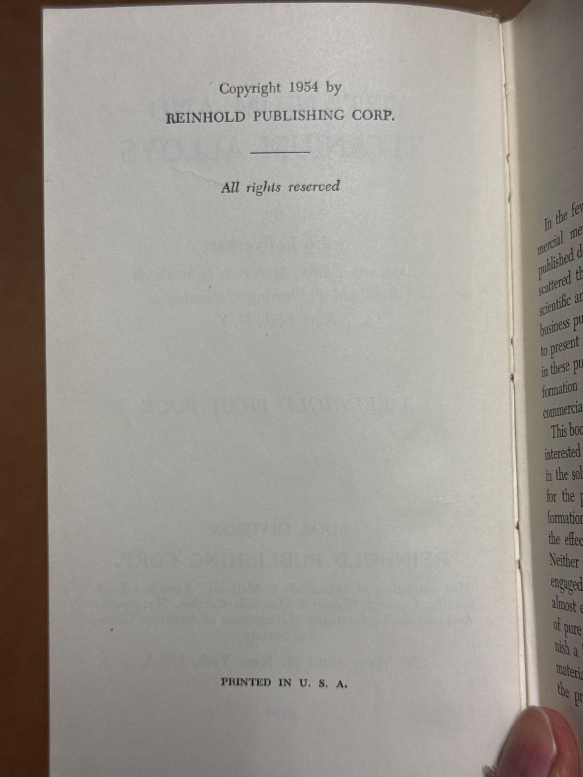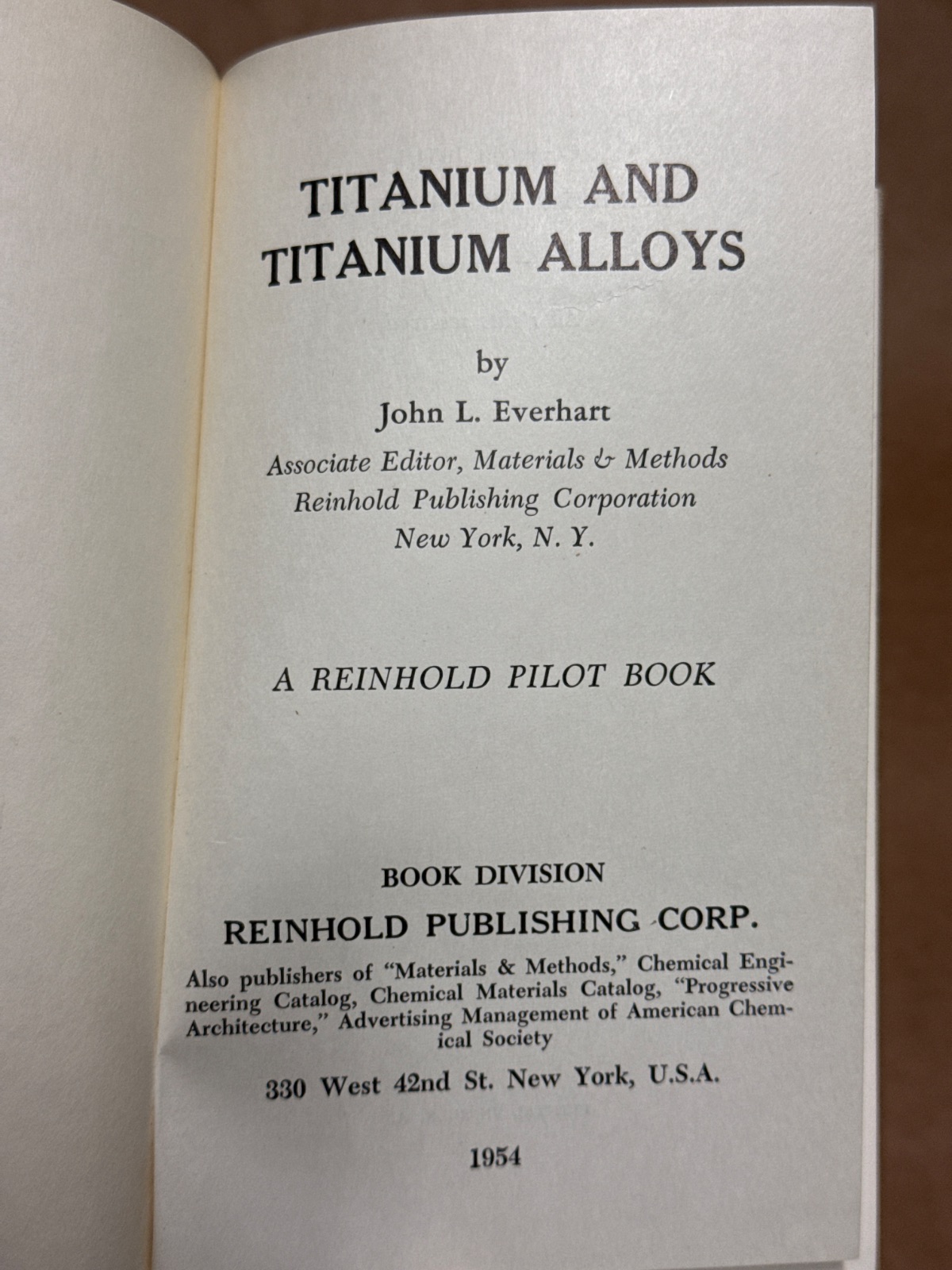 “Titanium and Titanium Alloys” by John L. Everhart, published by Reinhold Publishing Corp. in 1954, is a seminal work in the field of materials science. As an Associate Editor for “Materials & Methods,” Everhart brings valuable insights into the properties and applications of titanium and its alloys. This book, published in New York, is part of the Reinhold Pilot Books series, which is known for its authoritative texts in engineering and science. Although the edition is not specified, this 1954 publication provides a comprehensive overview of titanium’s role in industrial applications, making it an essential resource for engineers and metallurgists. The book is bound in a sturdy cloth cover, showing signs of wear typical for its age, but remains intact and functional. There is no dust jacket, and an inscription is present, adding a personal touch to this historic volume.
