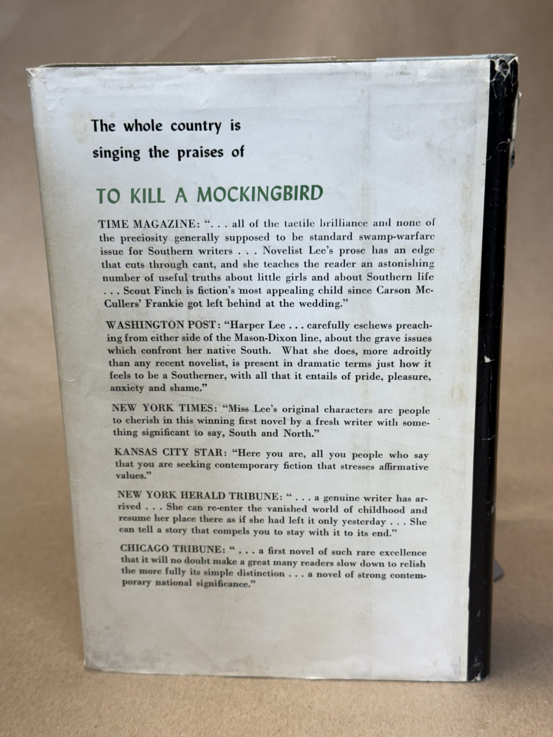 This early printing of Harper Lee’s seminal novel “To Kill a Mockingbird” is a cherished piece of American literary history. Published just two years after its initial release in 1960, this 23rd impression captures the rapid popularity of a work that challenged racial injustice and became an instant classic. While the dust jacket shows its age with tears and wear, the book itself remains in remarkably good condition, a testament to its enduring value. The clean pages and sturdy binding invite readers to immerse themselves in Lee’s Pulitzer Prize-winning narrative, which poignantly explores themes of courage, compassion, and the moral imperative to fight prejudice. A cornerstone of 20th-century literature, this edition offers collectors a tangible connection to a transformative novel that has shaped generations of readers and continues to resonate in our ongoing pursuit of equality and human dignity.