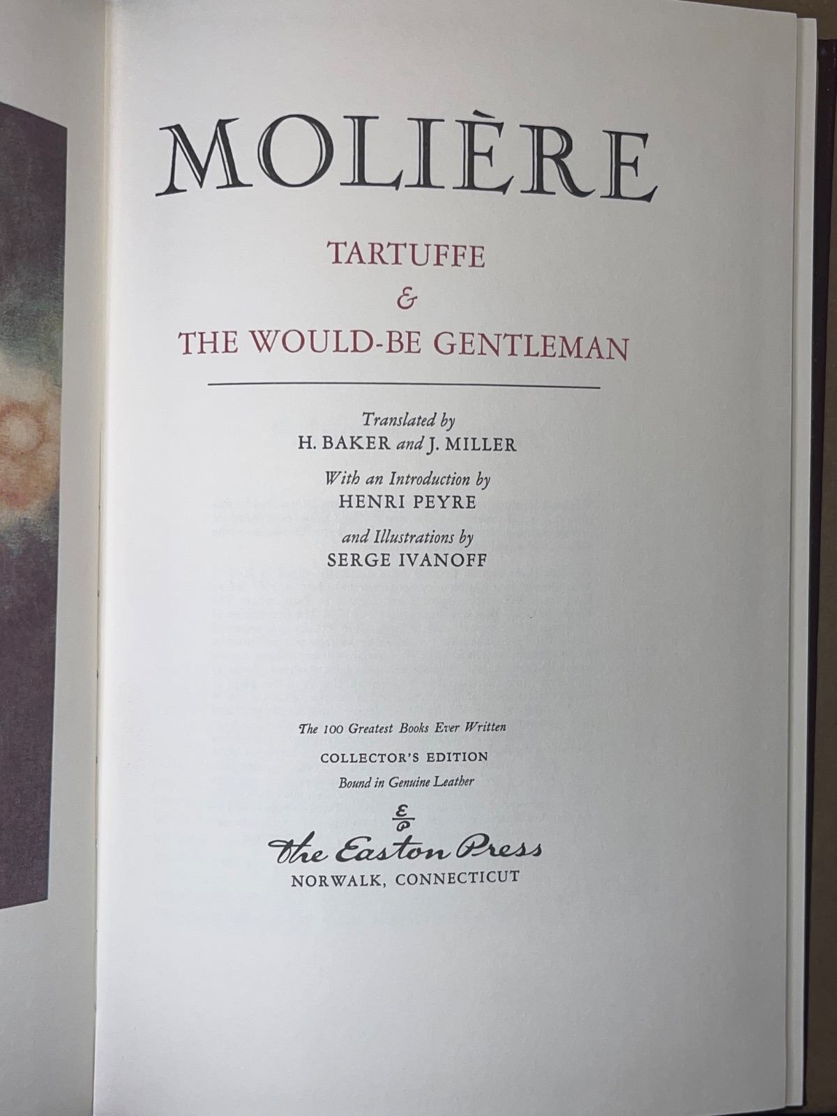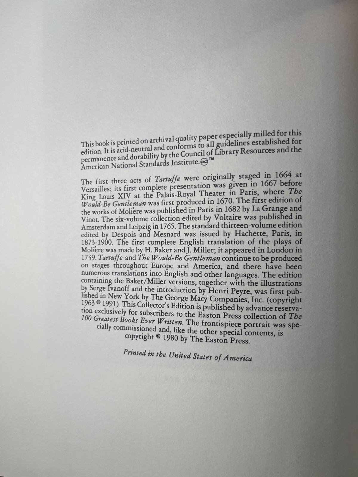 This exquisite Collector’s Edition of “Two Plays By Moliere – Tartuffe & The Would-Be Gentleman” is part of the Easton Press’s “100 Greatest Books Ever Written” series. Published in 1980, this volume showcases Molière’s celebrated comedic genius, translated by H. Baker and J. Miller, with an introduction by Henri Peyre. The book is beautifully illustrated by Serge Ivanoff, offering a visual complement to Molière’s sharp wit and social commentary. Bound in genuine leather, this edition features a rich burgundy cover adorned with intricate gold gilt designs, and the spine includes raised bands, adding to its classic appeal. The pages are printed on archival-quality, acid-neutral paper, ensuring longevity and durability. This edition is a must-have for collectors and enthusiasts of classic literature, offering a timeless exploration of human nature and societal norms.