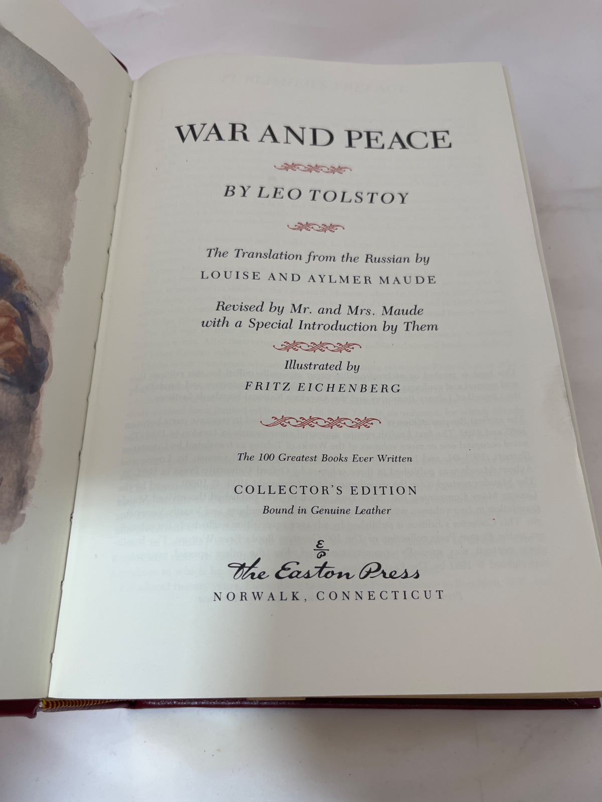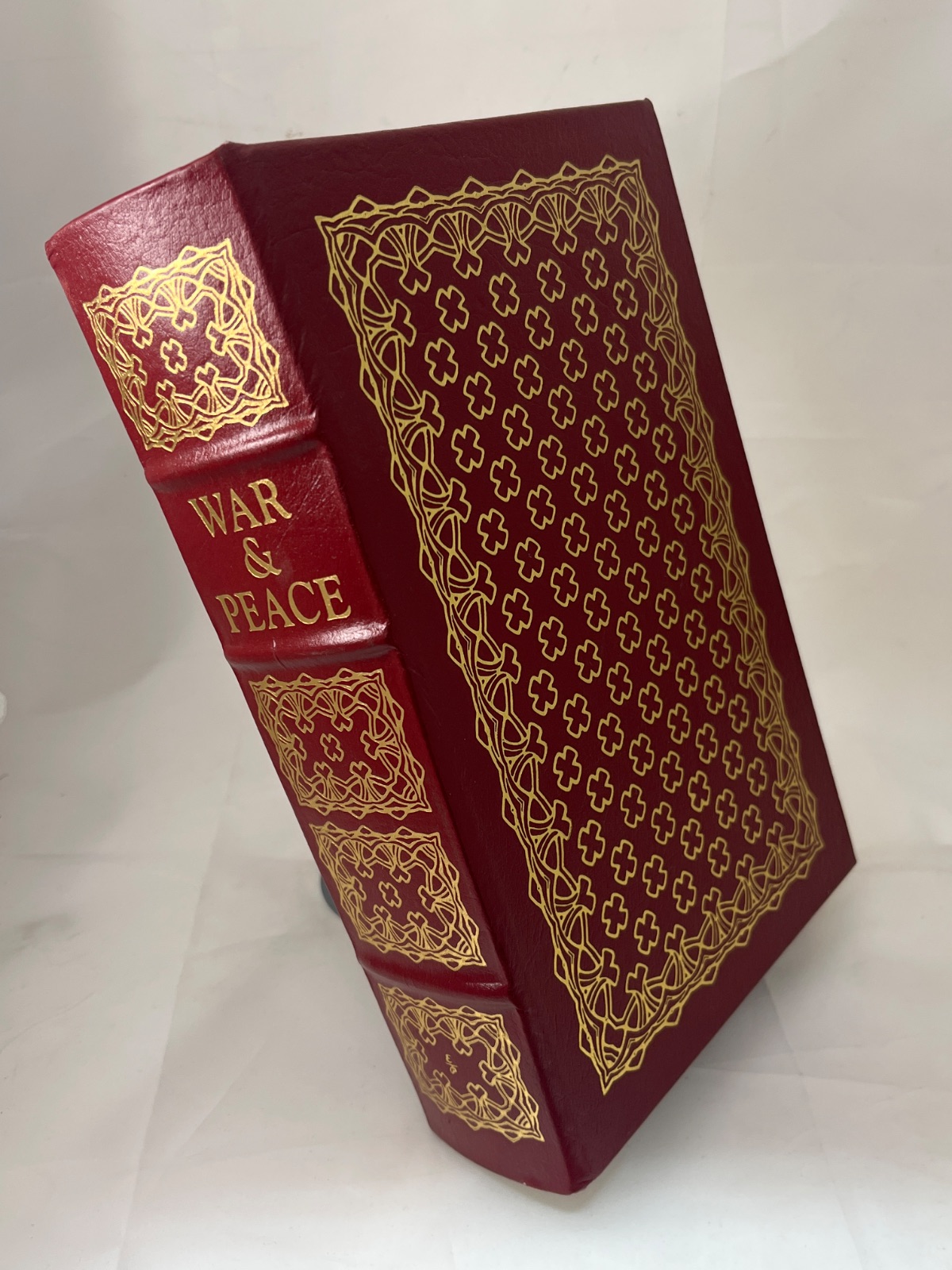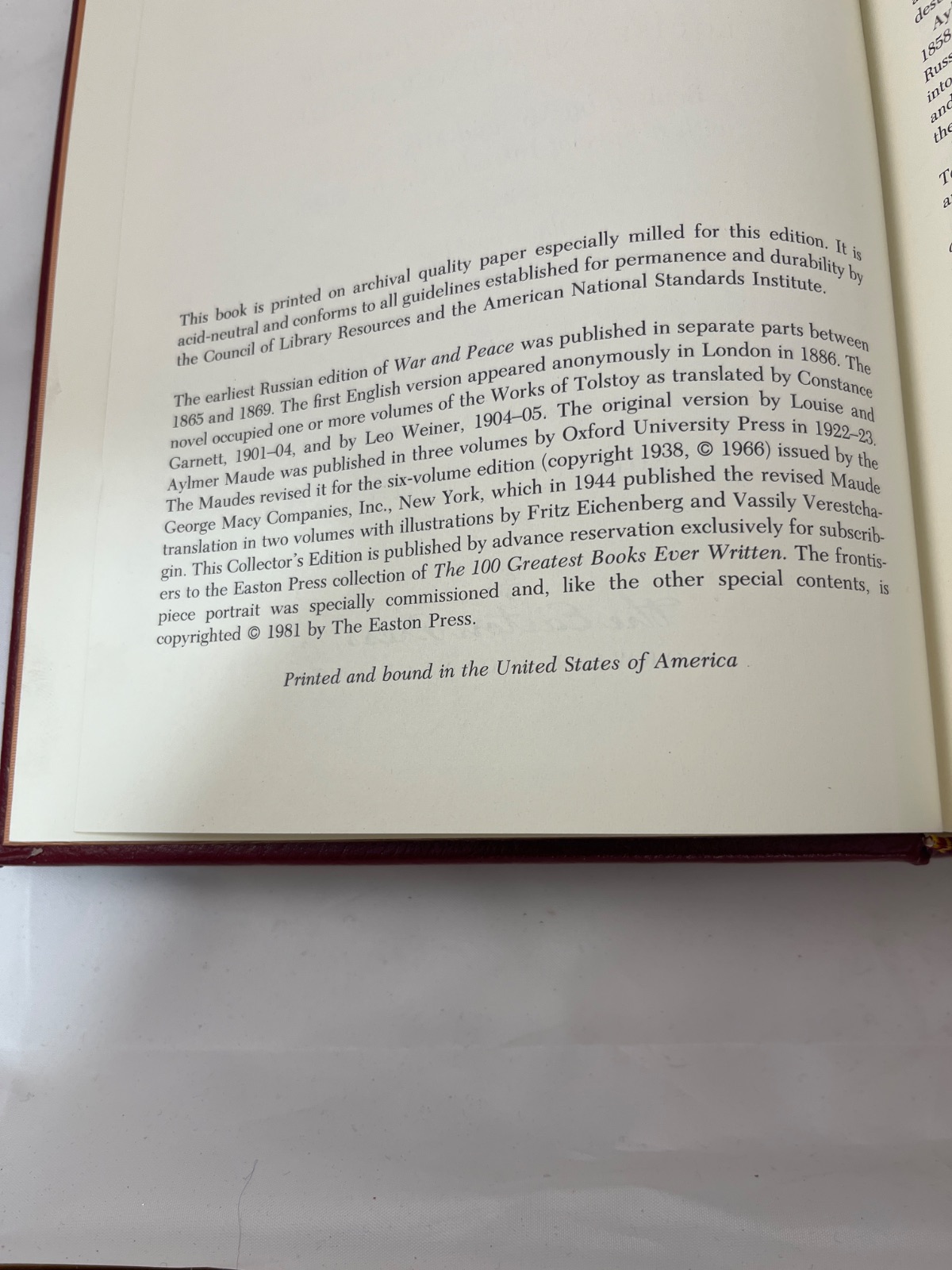 This exquisite Collector’s Edition of “War and Peace” by Leo Tolstoy is a striking example of fine book craftsmanship, published by The Easton Press in 1981. Bound in genuine red leather, the book features intricate gilt designs on both the cover and spine, highlighting its status as a treasured classic. The text is a translation by Louise and Aylmer Maude, with a special introduction by them, and is accompanied by evocative illustrations from Fritz Eichenberg. Printed on archival-quality, acid-neutral paper, this edition promises durability and longevity. “War and Peace” is an epic narrative that intricately weaves the lives of its characters against the backdrop of the Napoleonic Wars, exploring themes of love, fate, and the human condition. This volume is part of The Easton Press’s “The 100 Greatest Books Ever Written” series, making it a valuable addition to any collector’s library.