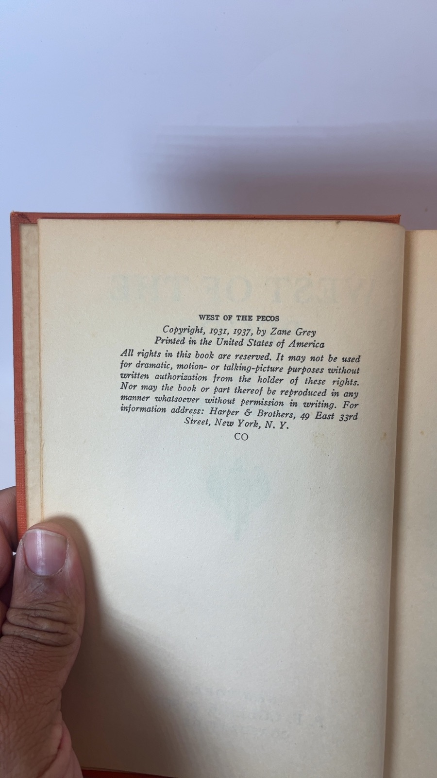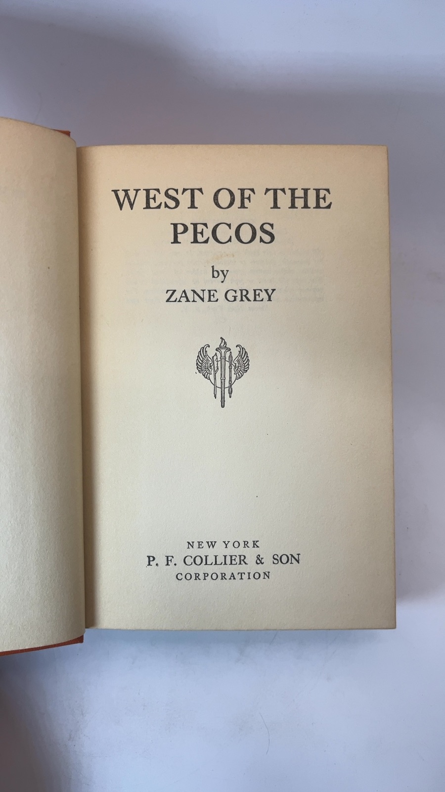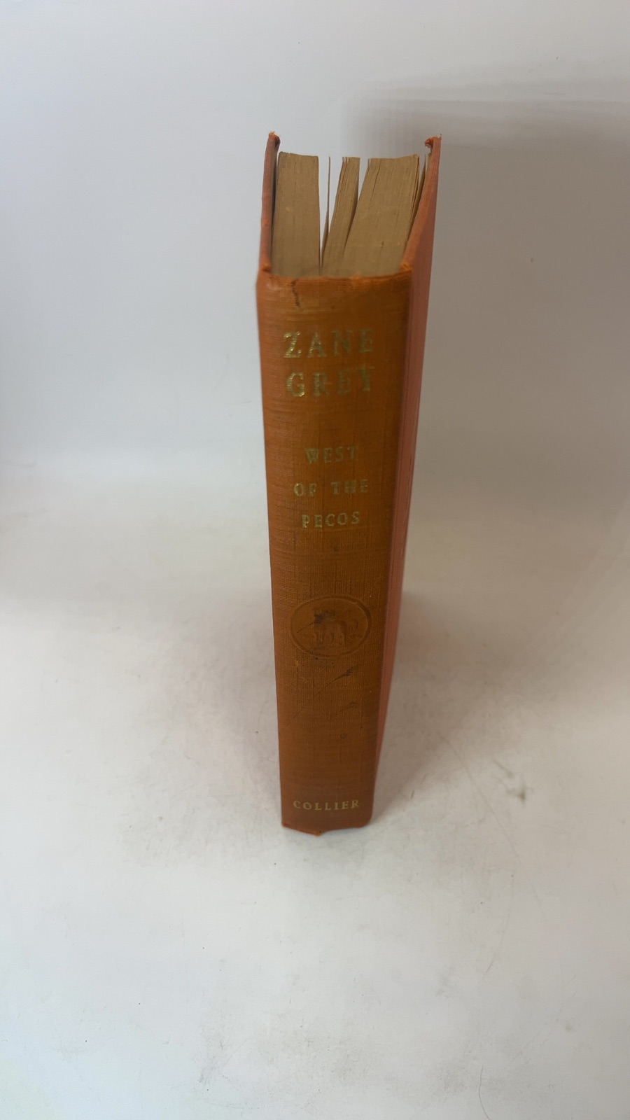 Step into the rugged landscapes of the American frontier with “West of the Pecos” by Zane Grey, a masterful storyteller renowned for his vivid depictions of the Wild West. Published by P. F. Collier & Son Corporation in 1937, this classic Western novel takes readers on an unforgettable journey through the untamed wilderness. Grey’s narrative captures the essence of adventure and the human spirit, weaving a tale of courage, love, and survival. This edition, with its sturdy orange cloth binding, is a testament to the enduring appeal of Grey’s storytelling. A must-have for collectors and enthusiasts of Western fiction, this book embodies the spirit of the frontier and the timeless allure of the West.