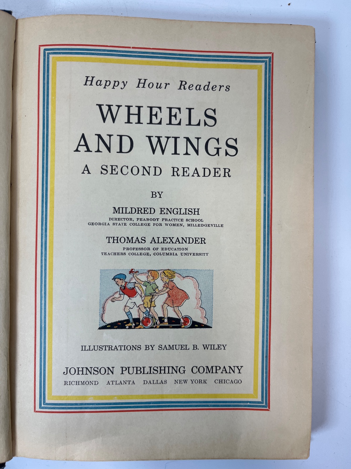 “Wheels and Wings: A Second Reader” is an enchanting addition to the Happy Hour Readers series, crafted by the insightful Mildred English and Thomas Alexander. Published in 1935 by the Johnson Publishing Company, this book is a delightful journey into the world of transportation, capturing the imagination of young readers with its vivid illustrations by Samuel B. Wiley. The book is designed to engage children with stories of bicycles, airplanes, and trains, fostering a love for reading and exploration. Its vibrant cover and charming endpapers depict scenes of children at play, making it not only a literary treasure but also a visual delight. This volume serves as an educational tool, introducing early readers to the wonders of wheels and wings, and is an ideal collectible for enthusiasts of vintage children’s literature.